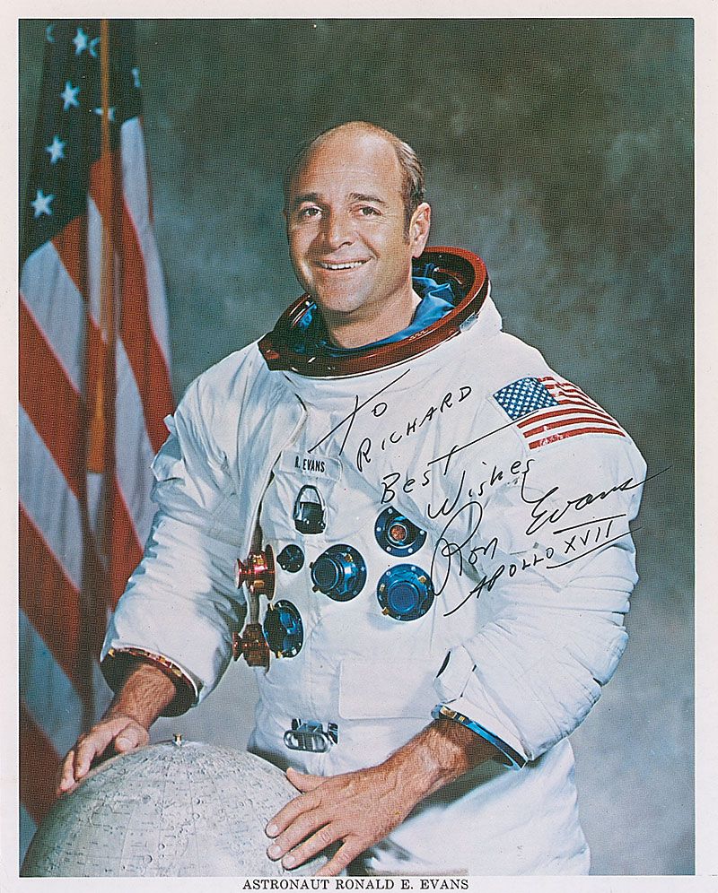Color 8 x 10 NASA photo of Evans in his white spacesuit, signed and inscribed in black felt tip “To Richard, Best wishes, Ron Evans, Apollo XVII.” In fine condition.