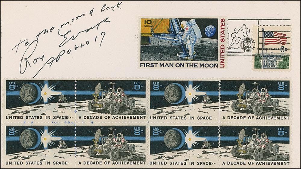Postal cover bearing nine commemorative stamps, signed in the upper left in black ink, “To the moon & back, Ron Evans, Apollo 17.” In fine condition. Pre-certified Scott Cornish and RRAuction COA.