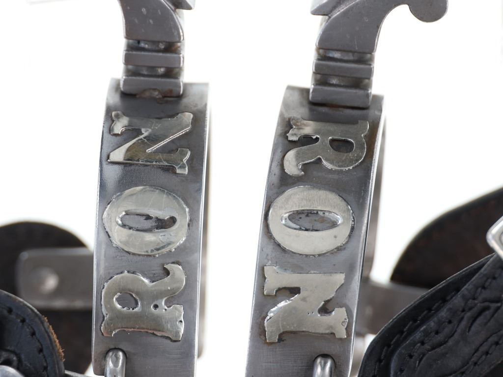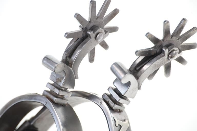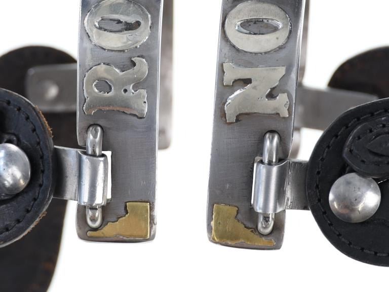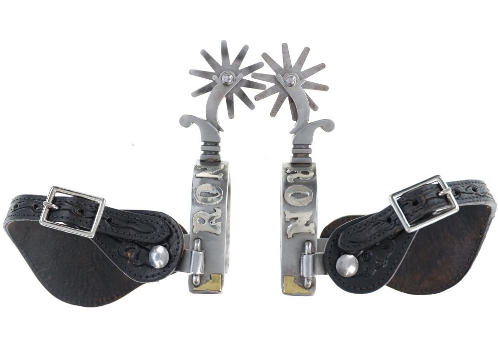 This is the personally owned custom-made double silver mounted spurs from Ron Gillett from the 20th-century from the Ron and Linda Gillett ex-collection. Ronald Earle Gillett (1940-2024) of Hagerman, Idaho was considered one of the foremost experts on high-end spurs, chaps, bits, bridles, saddles, and guns of the cowboy era. He owned the best set of Qualley Brother Spurs, which sold at Morphy auction in 2024 for $25,200. This set shows a beautiful California pattern spur with squared off drop shank with large chap guard and rowels. The body is silver and brass mounted with RON in silver and an Idaho state outline in brass on one side and Triangle-C brand on the other side in silver. The set has black spur straps and are well kept. Ron Gillett also had a set of Steve Schmidt custom made bit previously sold at auction for $1300 in 2025. These are not signed. From the Ron and Linda Gillett collection Hagerman, ID. Measures overall 11-inches from rowel to back of strap by 4.25-inch wide.