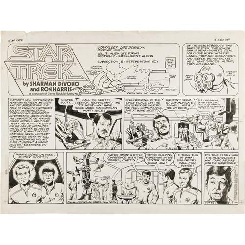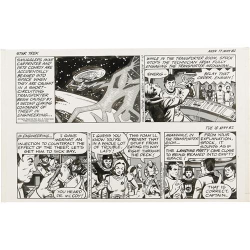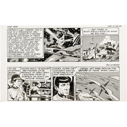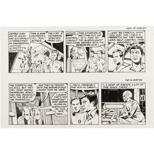 The crew of the Enterprise investigates the fate of a Bebebebeque colony on Mimit, in this set of Star Trek comic strips, written by Larry Niven, and Sharman DiVono, and illustrated by Ron Harris. Includes six dailies, dated 3-15-82, 3-16-82, four consecutive dailies, dated to 3-20-82 to 3-20-82, and a Sunday, dated 3-14-82. The dailies each have an image area of 16" x 4.75" and the Sunday has an image area of 22.5" x 15.75". In Very Good condition.<BR><BR><b>Shipping:</b> Flat Material, Large (<a target="_blank" href="http://www.heritageauctions.com/common/shipping.php">view shipping information</a>)