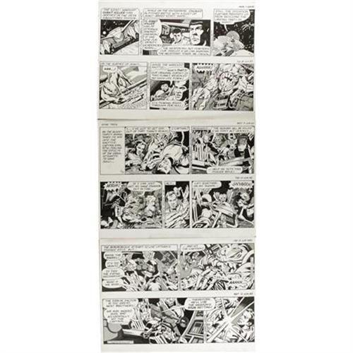 <B>Ron Harris and Larry Niven - Star Trek Sunday and Daily Comic Strip Original Art, Group of 7 (L.A. Times Syndicate, 1982).</B></I> The crew of the Starship Enterprise star in a week's worth of strips starting with the Sunday dated 6-6-82, and continuing in six dailies, dated 6-7 through 6-12-82. This sequence hails from the storyline, "The Wristwatch Plantation," written with noted science fiction author Larry Niven. The dailies have an image area of 16" x 5" (and are drawn two to a page), while the Sunday has an image area of 22" x 15.75, and the art averages Excellent condition. <BR><BR><b>Shipping:</b> Flat Material, Large (<a target="_blank" href="http://www.heritageauctions.com/common/shipping.php">view shipping information</a>)