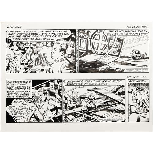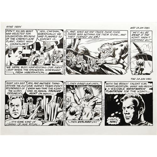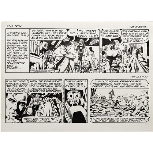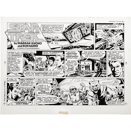 <B>Ron Harris - Star Trek Sunday and Daily Comic Strip Original Art, Group of 7 (L.A. Times Syndicate, 1982).</B></I> The crew of the Starship Enterprise stars in a week's worth of strips starting with six dailies, dated 6-21 through 6-26-82 and ending with the Sunday dated 6-27-82. These strips feature science fiction writer Larry Niven's plotline. The dailies have an image area of 16" x 5" (and are drawn two to a page), while the Sunday has an image area of 18" x 12.5". The art averages Excellent condition.<BR><BR><b>Shipping:</b> Large Flat (<a target="_blank" href="http://www.heritageauctions.com/common/shipping.php">view shipping information</a>)