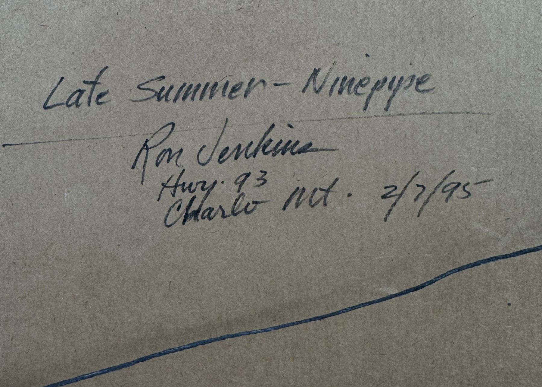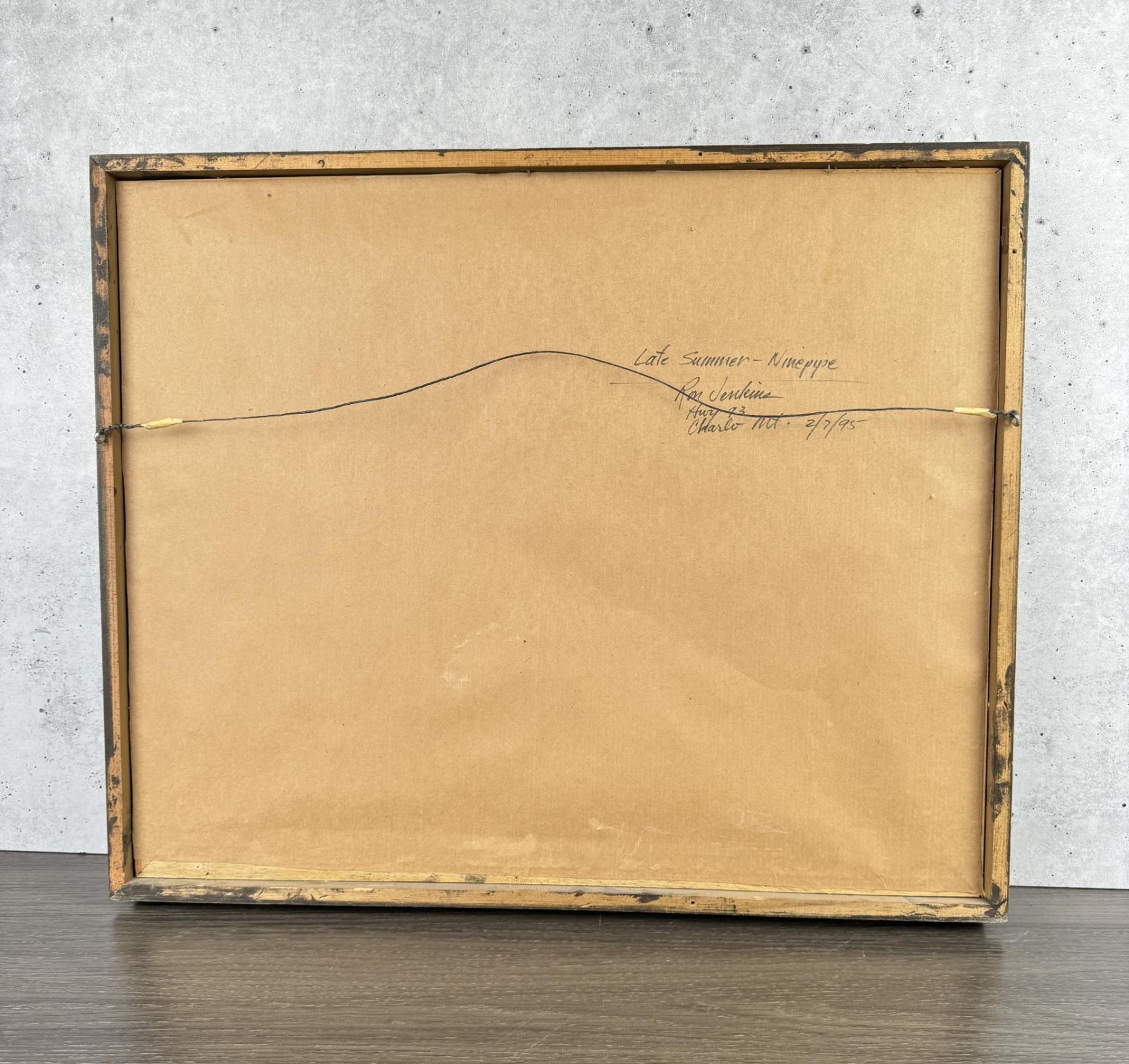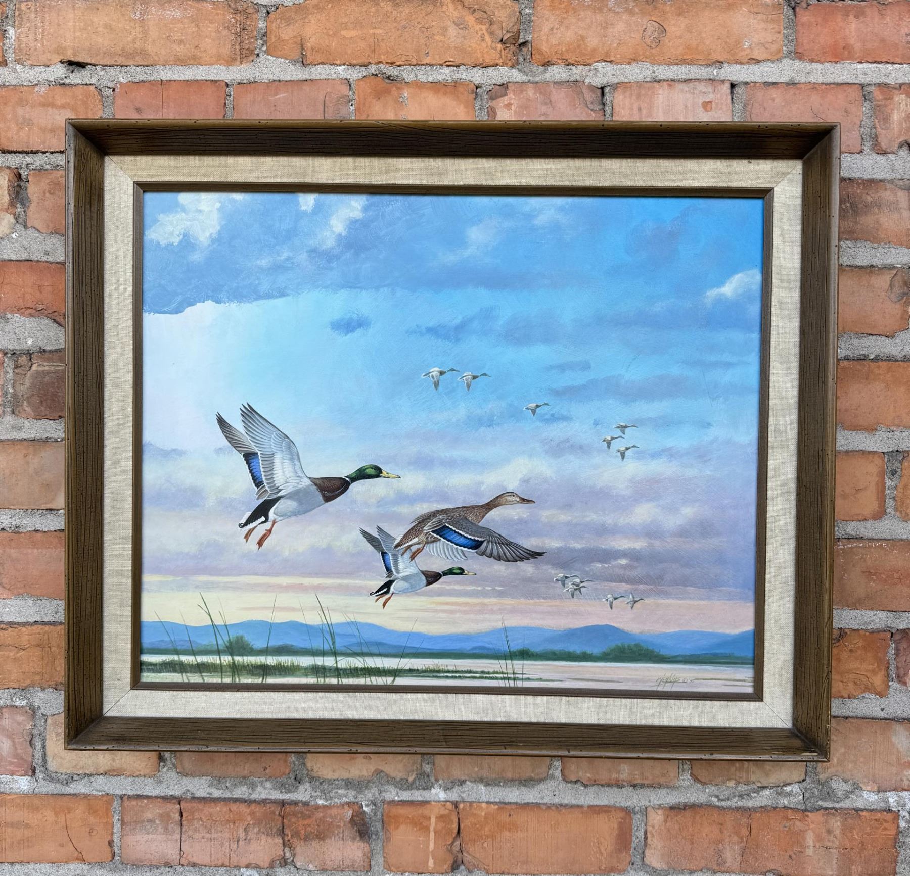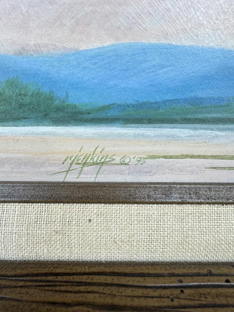 Title is Late Summer at Ninepipe. 18 1/2" by 23" framed. Ron Jenkins was born on August 18, 1932 in Pawtucket, Rhode Island and then was raised in Carlisle, Pennsylvania. He attended the Philadelphia Museum School of Art throughout the academic year of 1954-1955, but increasing family responsibilities prompted him to drop his art education temporarily to go to work for a savings and loan association. It was a job he was to hold for ten years, but in the meantime he began a correspondence course in art that ran from 1958 to 1962. He works fast, and although he will tackle any subject, birds are his favorite; his work on them goes especially fast. In fact, he spent so little time, comparatively speaking, on the 1964 painting of canvasbacks that von the 1965-66 Federal Duck Stamp Competition that it gave him mildly embarassed pause; he had almost not submitted it at all. He has illustrated a number of stories for the Pennsylvania Game News and the Pennsylvania Angler. His work has also appeared in the National Geographic magazine and the Modern Game Breeding magazine. In 1980, he won the third annual Montana Bird Stamp Design contest with his Whistlers'or Barrows Goldenyes, which he produced in two medium which was that of a reproduction edition and a hand colored stone lithograph edition. In 1993, Ron was selected as the 1993 First of State for the Rhode Island Trout Conservation Stamp with his work of a brook trout during a Rhode Island caddis hatch.