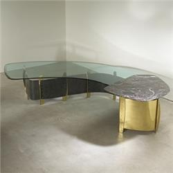 Ron Krueck and Mark Sexton dining table for the Weinstein residence, Chicago Tesko USA, 1985 tempered glass, marble, brass, steel 160"w x 86"d x 32"h This large, one-of-a-kind dining table was custom made for the Joan Weinstein residence in Chicago. Joan Weinstein was the founder of Ultimo, a haute-couture boutique in Chicago, and the first to bring high fashion to the Midwest beginning in the 1970s. Ms. Weinstein hired the young firm of Krueck and Sexton to remodel her turn of the century house in Chicago's Gold Coast, designed by Stamford White. This table features a thick glass top that has a unique bevel that changes from edge to edge. This massive glass is set on a serpentine base constructed of mild steel and solid brass. Provenance: Joan Weinstein, Chicago Private collection, Chicago
