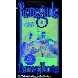 <table><tr><td><TABLE cellSpacing=0 cellPadding=0 width="100%" bgColor=#000000 border=0><TBODY> <TR><TD width="100%"><TABLE cellSpacing=1 cellPadding=3 width="100%" border=0><TBODY><TR><TD width="100%" bgColor=#79735c><FONT face=arial color=#ffffff size=3><B>Description</B> </FONT></TD></TR><TR><TD width="100%" bgColor=#ffffff><FONT face=arial size=2><B>Ron Lesser - Original Paperback Cover Art (1980).</B></I><BR><B>Warner Books #94-233 Renegade #4 Death Hunter</B></I> by Ramsay Thorne, part of the "Captain Gringo" series of adult westerns. Caption: "Captain Gringo - free and fighting. No man can stop him. No woman can hold him."<BR>Acrylic on board, image size approximately 22 x 13.5. Not signed.<BR>A color copy of the published paperback cover is included.<BR><BR>keywords: illustrator, illustration, action, adventure, western, vintage paperback <B>Estimate: $150-up</B> (2 items) </FONT></TD></TR></TBODY></TABLE></TD></TR></TBODY></TABLE><BR><!--<a name="PricesRealized"></a> <table width="100%" border="0" cellspacing="0" cellpadding="0" bgcolor="#000000"> <tr> <td width="100%"> <table width="100%" border="0" cellspacing="1" cellpadding="3"> <tr> <td width="100%" bgcolor="#79735C"> <a name="PR"> <font face="arial" size="3" color="#FFFFFF"> <b>Previous Prices from Heritage Auctions</b> </td> </tr> <tr> <td bgcolor="#F6F6ED"> No Prior Data Recorded </td> </tr> <tr> <td bgcolor="#FFFFFF"> <font face="arial" size="1""> PLEASE NOTE: All prices realized reflect the final hammer price PLUS the buyer's premium in auctions that charge a buyer's premium. Each item has a notation at the top of the listing indicating whether that lot included a buyer's premium. Example: A item that sells with a final hammer price of $100 and a 15% buyer's premium will display with a price realized of $115. All information listed is intended to be as accurate as possible, but errors are possible. Please use this guide carefully and inform us of any inaccuracies. </td> </tr> </table> </td> </tr> </table>