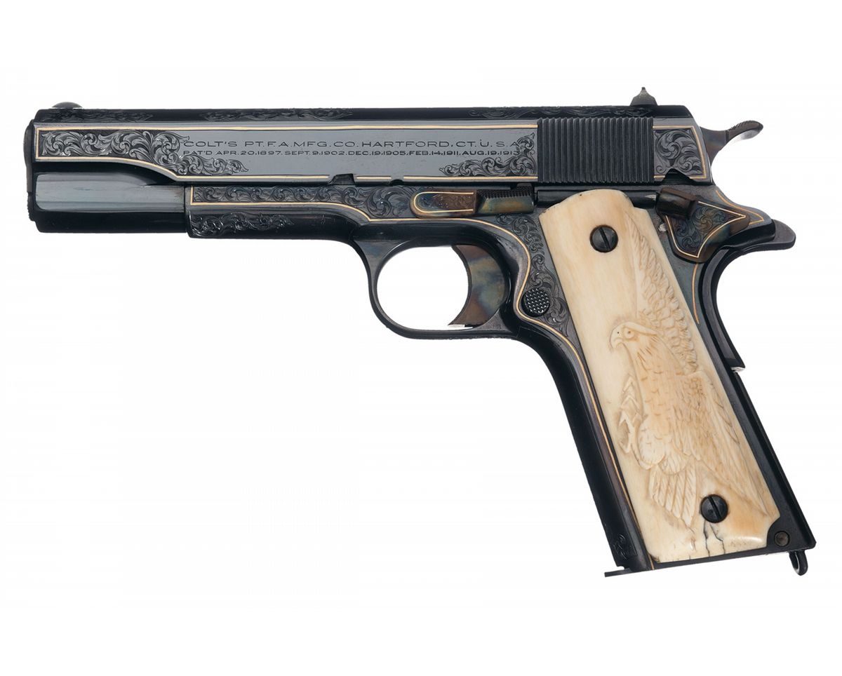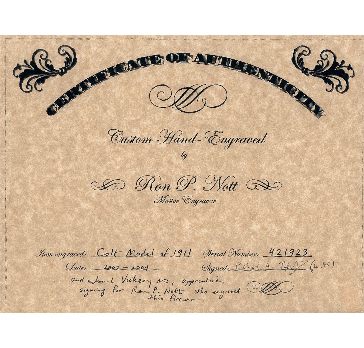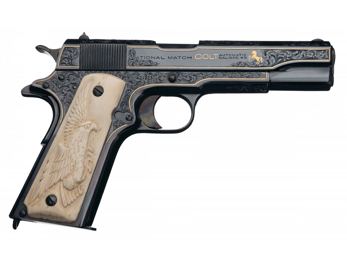 This example was originally manufactured in 1918 as a Colt 1911 Government Model and was subsequently assembled, engraved and gold inlaid. The frame, slide, thumb safety and slide stop have nicely executed floral scroll engraving. There is a gold inlay border on the frame, slide, slide stop and thumb safety with the Rampant Colt and "COLT" on the right side of the "NATIONAL MATCH" slide serial number 199,901. The trigger, slide stop, thumb safety and hammer are casehardened. Fitted with a pair of ivory grips with both carved with a flying eagle. With a glass lid hardwood display case lined with red fabric. Comes with a certificate of Authenticity of custom hand engraving by Master Engraver Ron P. Nott and two extra stainless steel magazines with Wilson Combat floor plates that have been engraved with "1923-1" and "1923-2".