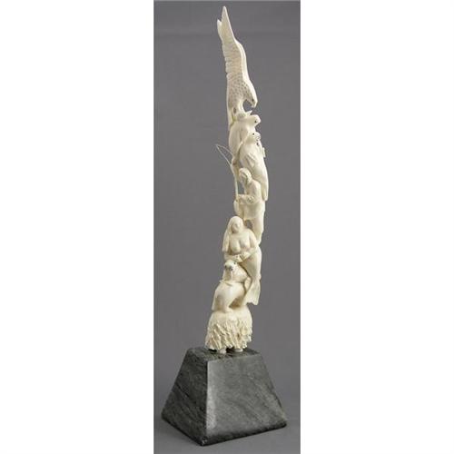 Canadian, Tuktoyaktuk [b. 1967] TOTEM WITH FIGURES AND ANIMALS; 1996 carved walrus tusk with ivory, bone and sinew accents on a soapstone base 18 in. (45.7 cm) high signed & dated
