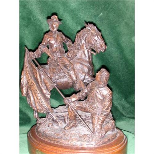 A limited edition signed and numbered bronze sculpture titled "Advance the Standard" by Ron Tunison, ca. 1990. The piece depicts a mounted Confederate cavalryman retrieving the Battle Flag from an exhausted color bearer down on one knee, to carry it further into the line of battle. It is on a hardwood base with a gold title plate. The piece is artist signed and numbered 128 of 350 editions. This sculpture has been fully subscribed and all molds and casts have been destroyed. It stands 12 inches tall and the base measures 9 3/4 inches long and 8 inches wide. Additional photo images are available upon request. Shipping quoted upon sale.