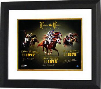 This is a Triple Crown Glory Champions Collage 16X20 Photo with Secretariat with Ron Turcotte (1973), Seattle Slew with Jean Cruguet (1977), and Affirmed with Steve Cauthen (1978). The Triple Crown is an unofficial championship attributed to a Thoroughbred horse that in a single season wins the Kentucky Derby, the Preakness Stakes, and the Belmont Stakes. Winning all three of these Thoroughbred horse races is considered the greatest accomplishment of a Thoroughbred racehorse. These are the last 3 Horses/Jockeys that have completed this milestone. Ron Turcotte, Jean Cruguet, and Steve Cauthen have all 3 signed this 16X20 Photo. Certificate of Authenticity from Athlon Sports Collectibles. Custom White Mat and Premium Black Framed as shown.
