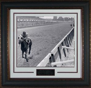 Ron Turcotte became internationally famous in 1973 when he rode Secretariat to the first Triple Crown win in 25 years. In the stretch at the Belmont Stakes, Secretariat opened a 1/16 mile lead on the rest of the field. At the finish, he won by 31 lengths (breaking the margin-of-victory record set by Triple Crown winner Count Fleet in 1943, who won by 25 lengths) and ran the fastest 1½ miles on dirt in history, 2:24 flat, which broke the stakes record by more than 2 seconds. This is Secretariat with Ron Turcotte Vintage B&W 16x20 Photo from the 1973 Belmont with Custom V Groove Matting and Premium Leather Framing.