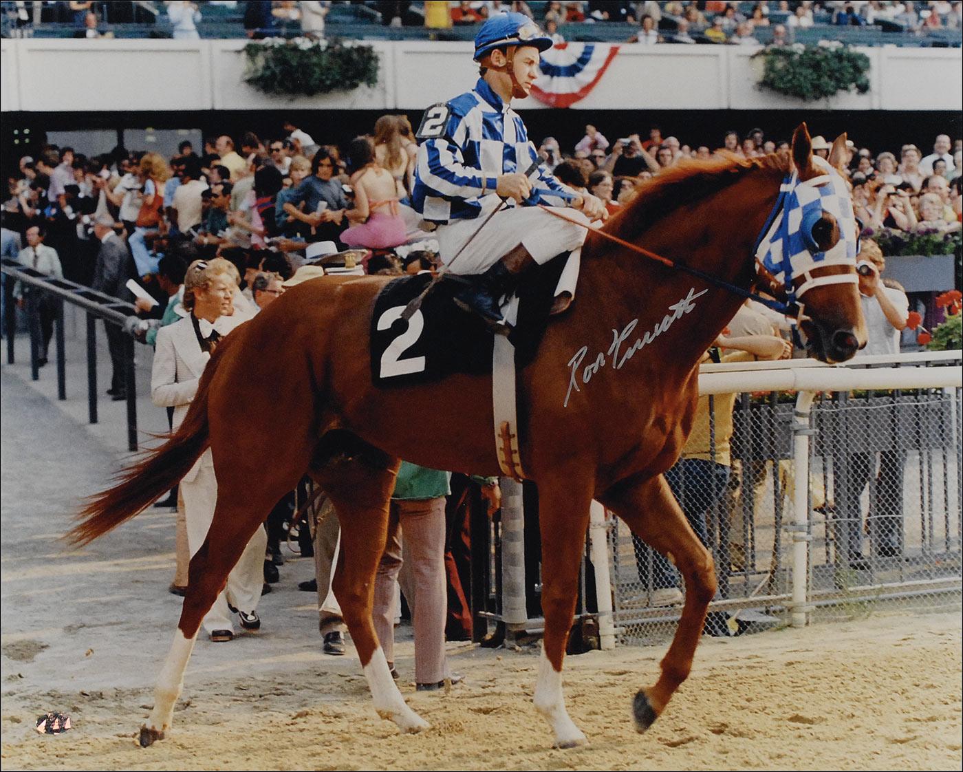 Color satin-finish 20 x 16 photo of Turcotte atop Secretariat, signed in silver ink “Ron Turcotte.” In fine condition, with a couple surface marks and tiny creases.