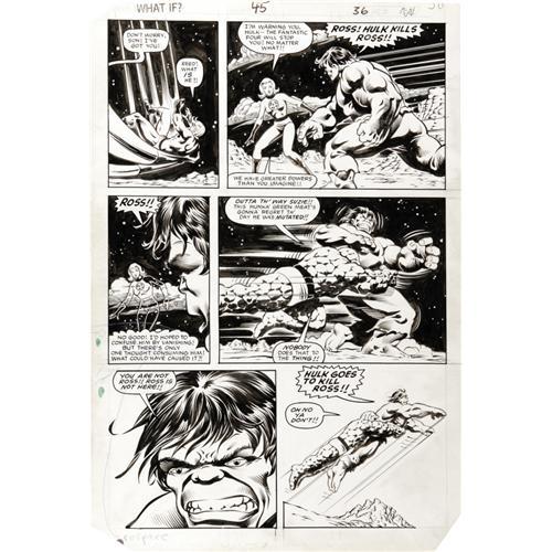 The Emerald Giant is hellbent on killing General Ross, but not if the World's Greatest Team has anything to say about it! Here is page 36 from the story, "What If the Hulk Went Berserk?," written by Peter B. Gillis. The art has an image area measuring 10" x 15", and, aside from three trimmed corners is in Very Good condition.<BR><BR><b>Shipping:</b> Small Flat (<a target="_blank" href="http://www.heritageauctions.com/common/shipping.php">view shipping information</a>)