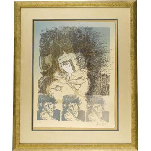 <B>Ron Wood Signed Limited Print 1/1.</B></I> Ronnie Wood's talents stretch far beyond his guitar work with the Stones, The Faces, and The Jeff Beck Group. In fact, Wood is an accomplished painter and master printmaker, as evidenced by this multi-block woodcut image of bandmate Keith Richards. Signed by Wood in the lower right corner and numbered 1 of 1, the print is a vary rare and unique piece -- a lot like its creator. The iconic musician began painting when he was 12 and received formal art training at Ealing College of Art in London until 1975, when he joined the Stones. And though he may be better known for his guitar work, his stunning paintings and prints have not been overlooked; Wood had a retrospective exhibition of his work at the Museum of Modern Art, Sao Paolo, in 1996 and a 2007 exhibition at the Bailly Contemporain Gallery in Paris. The celebrated guitarist also collects art, owning pieces by Toulouse-Lautrec, Matisse, Picasso, Rembrandt, and Georges Braque. His affection for the lattermost is apparent in this planar, textured image of Keith Richards. The central portrait of Richards' striking visage is underscored by three smaller impressions below, but it is the image itself that captures something we would not normally be privy to: an intensity and distinct character only a friend could know. Hand-signed by Wood in the lower right corner, the image is in Excellent condition and measures 22.5" x 29", framed to an overall size of 35" x 29." Though Wood usually parts with his artwork only if he has a duplicate image for himself, this piece is quite the exception. Because it is numbered 1 out of an edition of 1, there is no other piece like this one anywhere, in any collection. Truly one of a kind.<BR><BR><b>Shipping:</b> Framed - with Glass, Large (<a target="_blank" href="http://www.heritageauctions.com/common/shipping.php">view shipping information</a>)