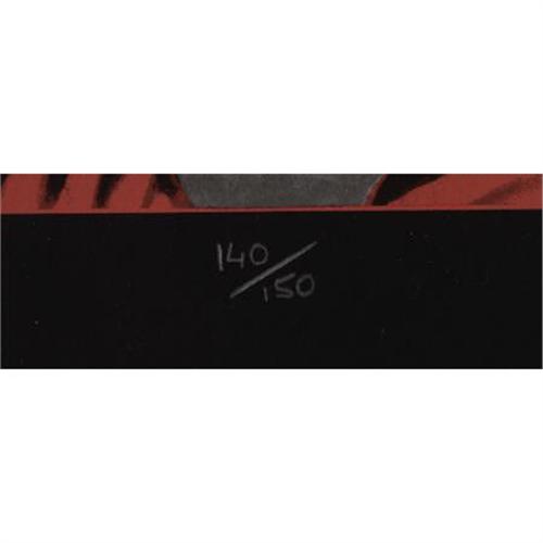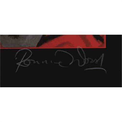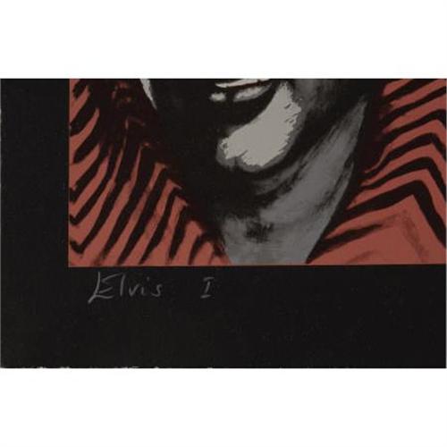 <B>Ron Wood Signed Limited Print.</B></I> Ron Wood's talents stretch far beyond his guitar work with the Stones, The Faces, and The Jeff Beck Group. In fact, Wood is an accomplished painter and master printmaker, as evidenced by this multi-image screenprint of Elvis Presley. Signed by Wood in the lower right corner and numbered 140 of 150, the print is a vary unique piece -- a lot like its creator. The iconic musician began painting when he was 12 and received formal art training at Ealing College of Art in London until 1975, when he joined the Stones. And though he may be better known for his guitar work, his stunning paintings and prints have not been overlooked; Wood had a retrospective exhibition of his work at the Museum of Modern Art, Sao Paolo, in 1996 and a 2007 exhibition at the Bailly Contemporain Gallery in Paris. The celebrated guitarist also collects art, owning pieces by Toulouse-Lautrec, Matisse, Picasso, Rembrandt, and Georges Braque. Wood's fondness for historically significant artists is present in this print done in the style of Andy Warhol. The image of Elvis repeated nine times presents a nod to both Warhol and the King, and is perhaps a comment on the exploitation of both artists' iconic status. The print was published in 1988 as one of an edition of 150 plus 18 proof prints, and is state one of two. Measuring 23" x 30", the piece is mounted in a linen-lined display frame to an overall size of 34" x 41". A stunning salute from one Rock and Roll icon to another. In Excellent condition. <I>Accompanied by a COA from PSA/DNA.</B></I><BR><BR><b>Shipping:</b> Framed - with Glass, Large (<a target="_blank" href="http://www.heritageauctions.com/common/shipping.php">view shipping information</a>)