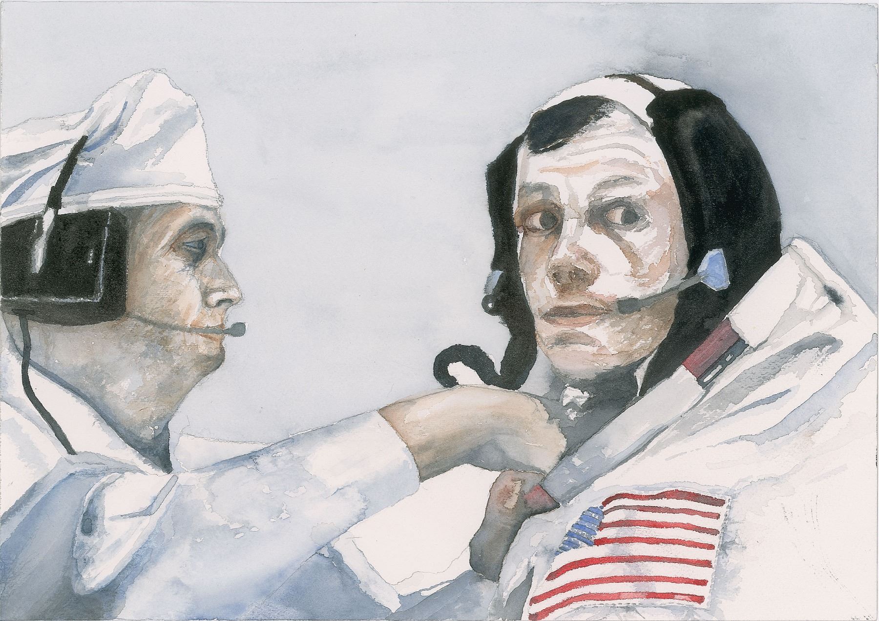 Terrific original painting of moonwalker Neil Armstrong being prepped by spacesuit technician Troy Stewart, Sr., on the morning of the historic Apollo 11 mission, accomplished in watercolor on a sheet of 14 x 10.25 archival paper by NASA suit technician-turned-artist Ron Woods. Signed on the reverse in pencil, "Troy, Sr., Ron Woods, 2019.” In fine condition. A wonderful rendering of the Apollo 11 Commander, his visage filled with anticipation as his suit is prepared at the Kennedy Space Center’s Manned Spacecraft Operations Building in the early hours of July 16, 1969.