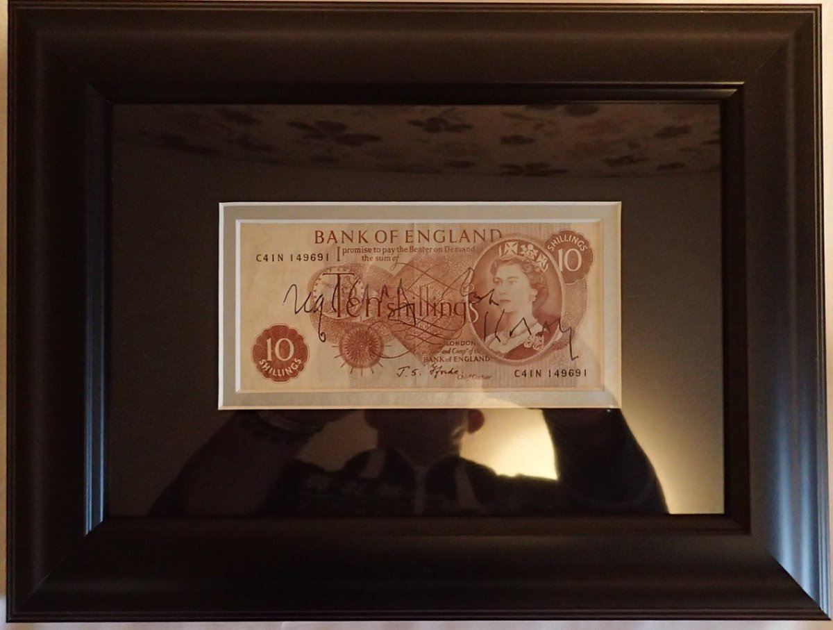 A vintage 10 shilling note that has been signed by the infamous Ron & Reg Kray. Mounted with black and silver trim. There is a centre fold to the note however the signatures are clear. This is a scarce set of Gangster signatures on one piece which measures 31 cm by 23 1/2 cm in size.