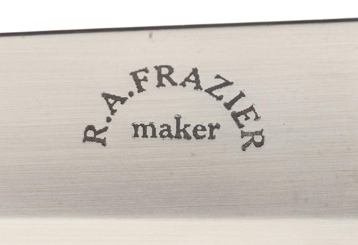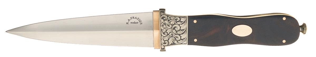 Ronald A. Frazier has been an award winning member of the Knifemakers' Guild for over 30 years and is best known for quality art knives. This Frazier boot knife has a 4 7/8 inch double edged blade marked "R.A. FRAZIER / maker". Sliver fittings with the short guard and bolster having a broad scroll engraving. The handle scales are crafted out of a nicely figured hardwood with either side featuring an oval appliqué and held in place with four rivets. OAL: 9 1/2"