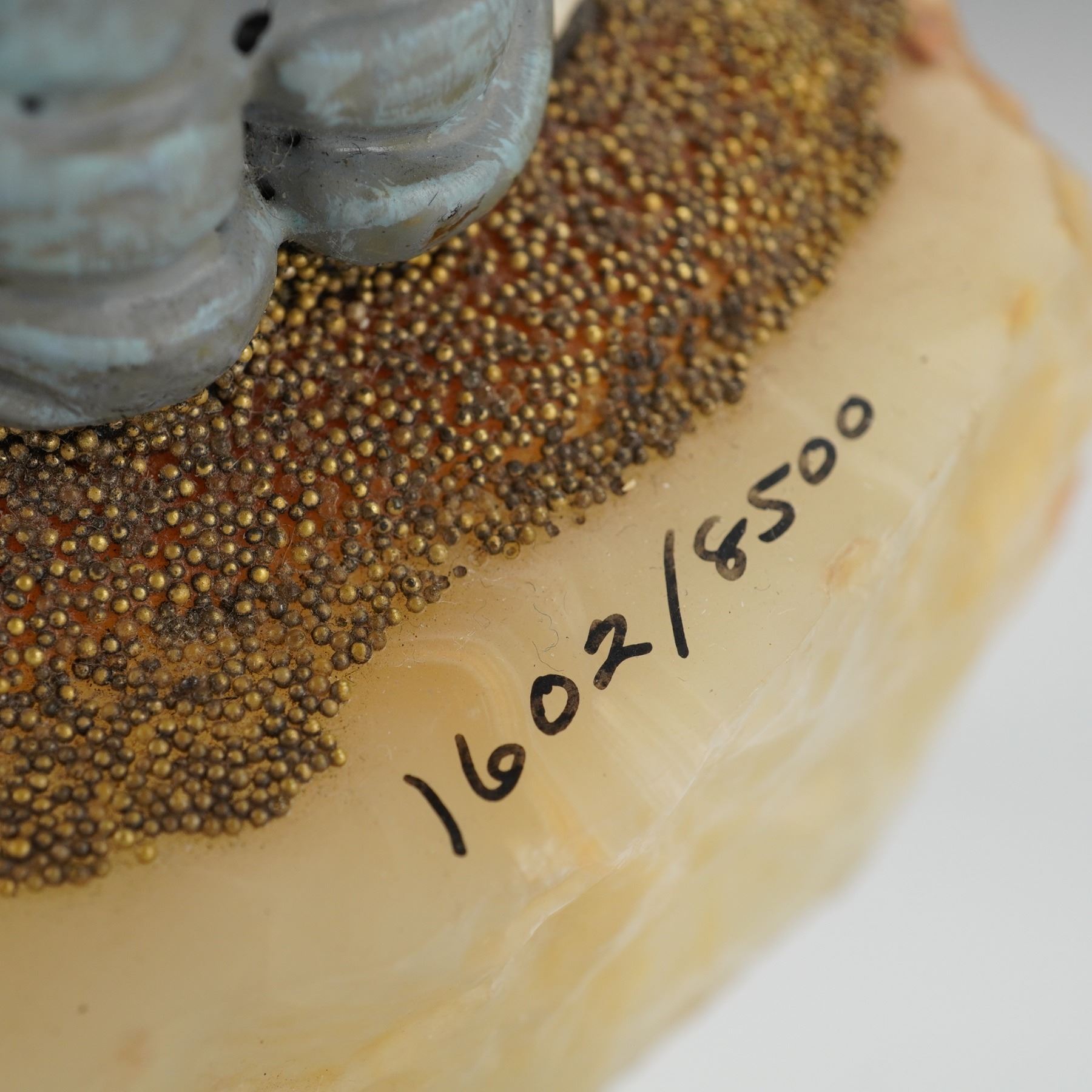 This limited-edition sculpture depicts a sad-faced hobo clown in a blue jacket, grey trousers, and a black top hat, holding a prominently broken red heart. The figure is constructed from painted resin or composite material. The clown stands upon a textured stone base covered in small 24k gold-plated beads, which is permanently affixed to a roughly cut block of translucent, onyx. The onyx base is Signed in black ink with the inscription "Ron '85" (referencing Ron Lee) and the edition number "1602/8500." The piece retains its original hanging biographical tag confirming it as a Creative Concept By Ronald A. Lee.