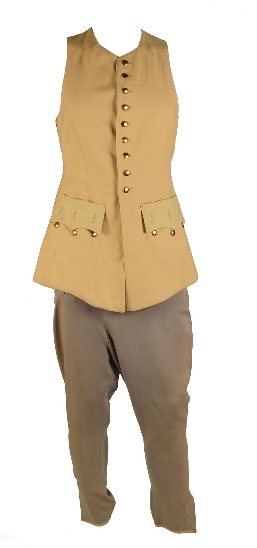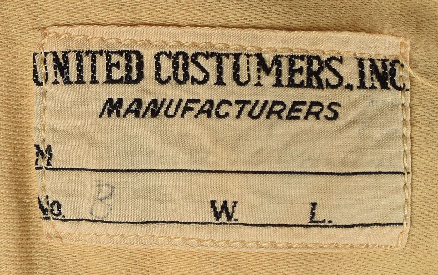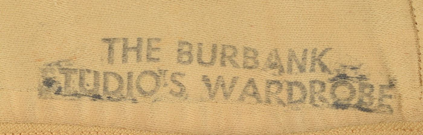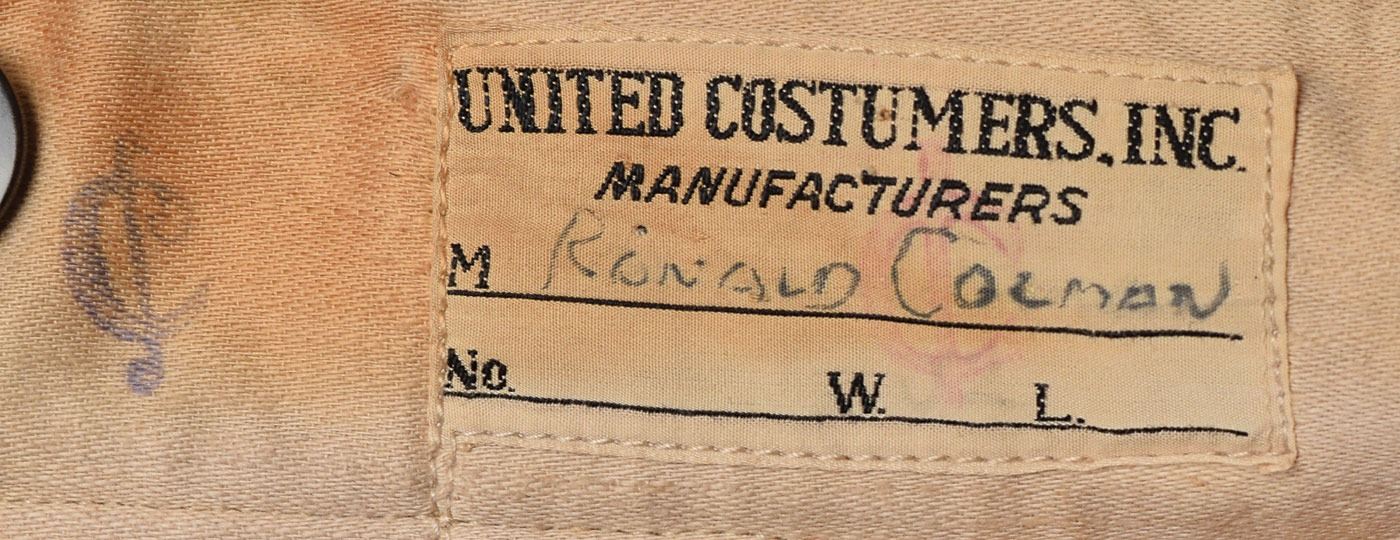 Outfit comprised of a long beige vest and gray pants, worn on screen by Ronald Colman in his starring role as Robert Clive in the 1935 biographical film Clive of India. The button-up vest has a beige linen front and brown satin back, stamped in the left front tail, "The Burbank Studio's Wardrobe," and has a United Costumers tag sewn in the back, annotated "Ronald Colman." The gray pants have a similar United Costumers tag sewn into the waistband, also marked "Ronald Colman." In overall fine condition, with expected wear.