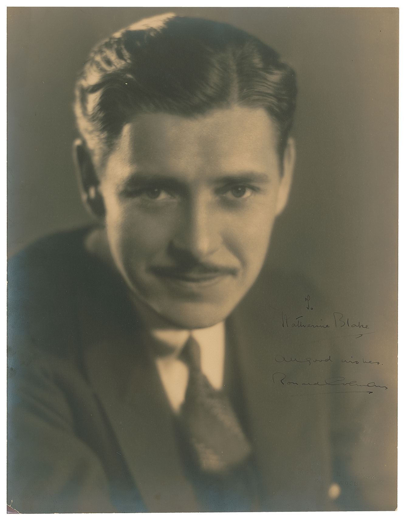 Vintage sepia matte-finish 10.25 x 13.5 photo of Ronald Colman by noted Hollywood portrait photographer Melbourne Spurr, signed and inscribed in fountain pen, "To Katherine Blake, All good wishes, Ronald Colman.” Lower right features a Spurr blindstamp, and reverse bears the photography studio stamp. In fine condition, with light edge silvering, and a small repair to the missing lower left corner tip.