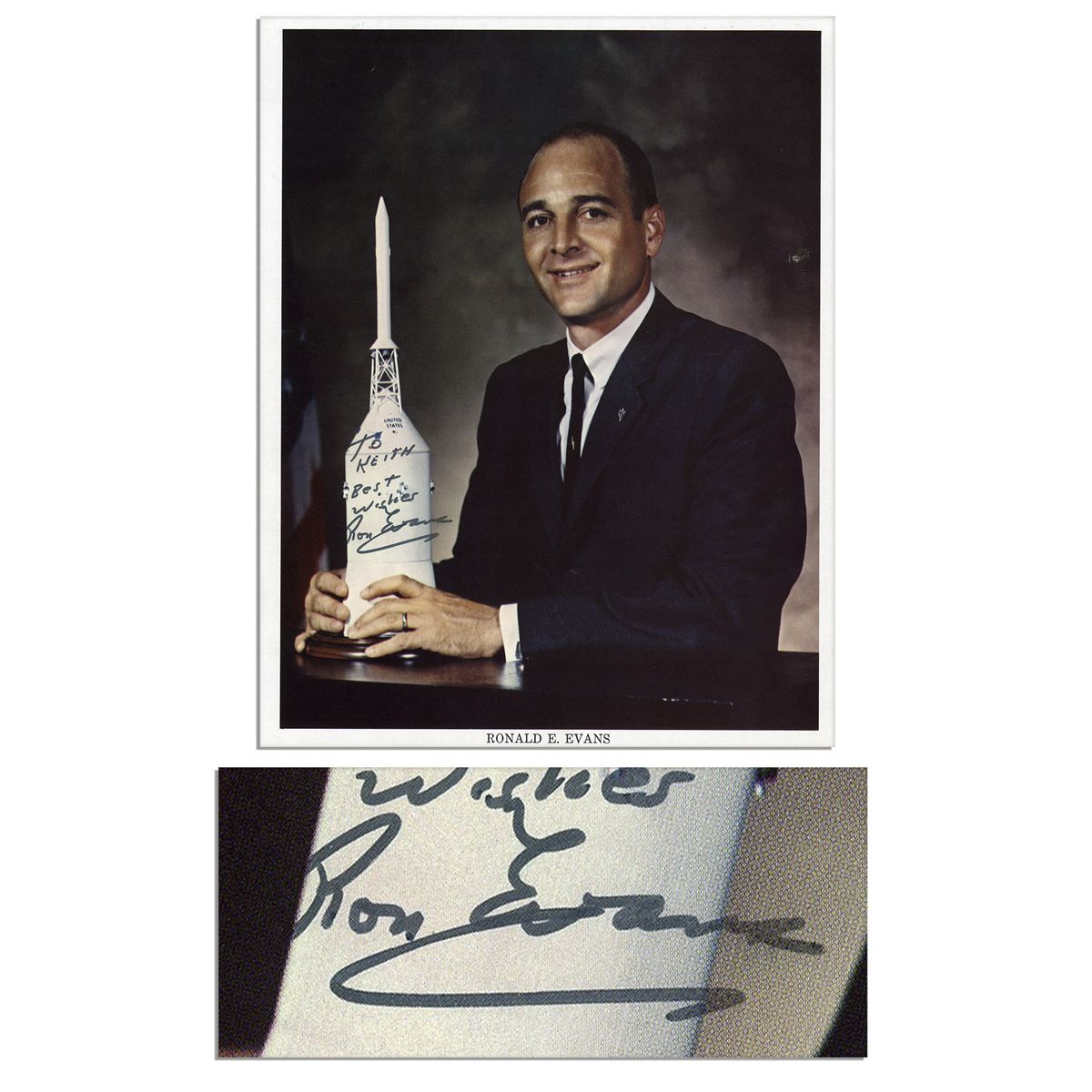 Ronald Evans portrait photo signed. The Apollo 17 astronaut's autograph inscription to the model spacecraft in his hands reads, ''To Keith / Best Wishes / Ron Evans''. Official NASA photo features Evans wearing a civilian suit and tie. A small summary of Evans is printed to verso along with the NASA logo. Color photo with semi-matte finish measures 8'' x 10''. Paperclip impression to top edge, else fine.