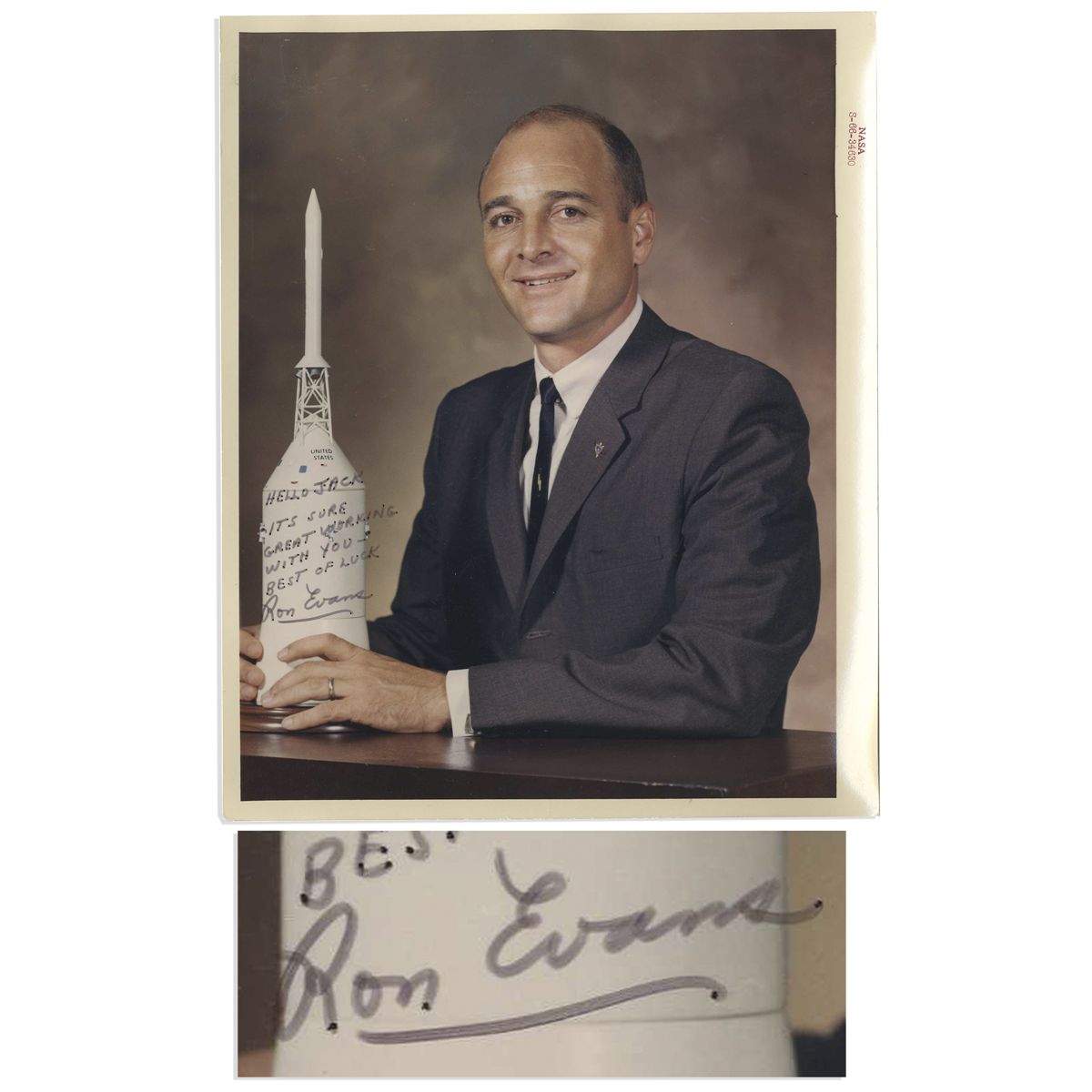 Apollo 17 Command Module Pilot Ronald Evans official NASA photo signed and inscribed to Jack Swigert. Evans poses in a suit holding a model spacecraft in his hands. Inscribed in black ink along spacecraft, ''Hello Jack / It's sure great working with you -- Best of Luck / Ron Evans''. Glossy photo measures 8'' x 10'' with curling to edges, else near fine. With an LOA from Swigert's sister.