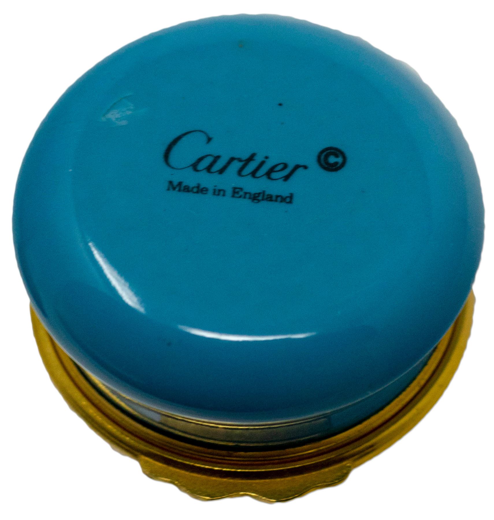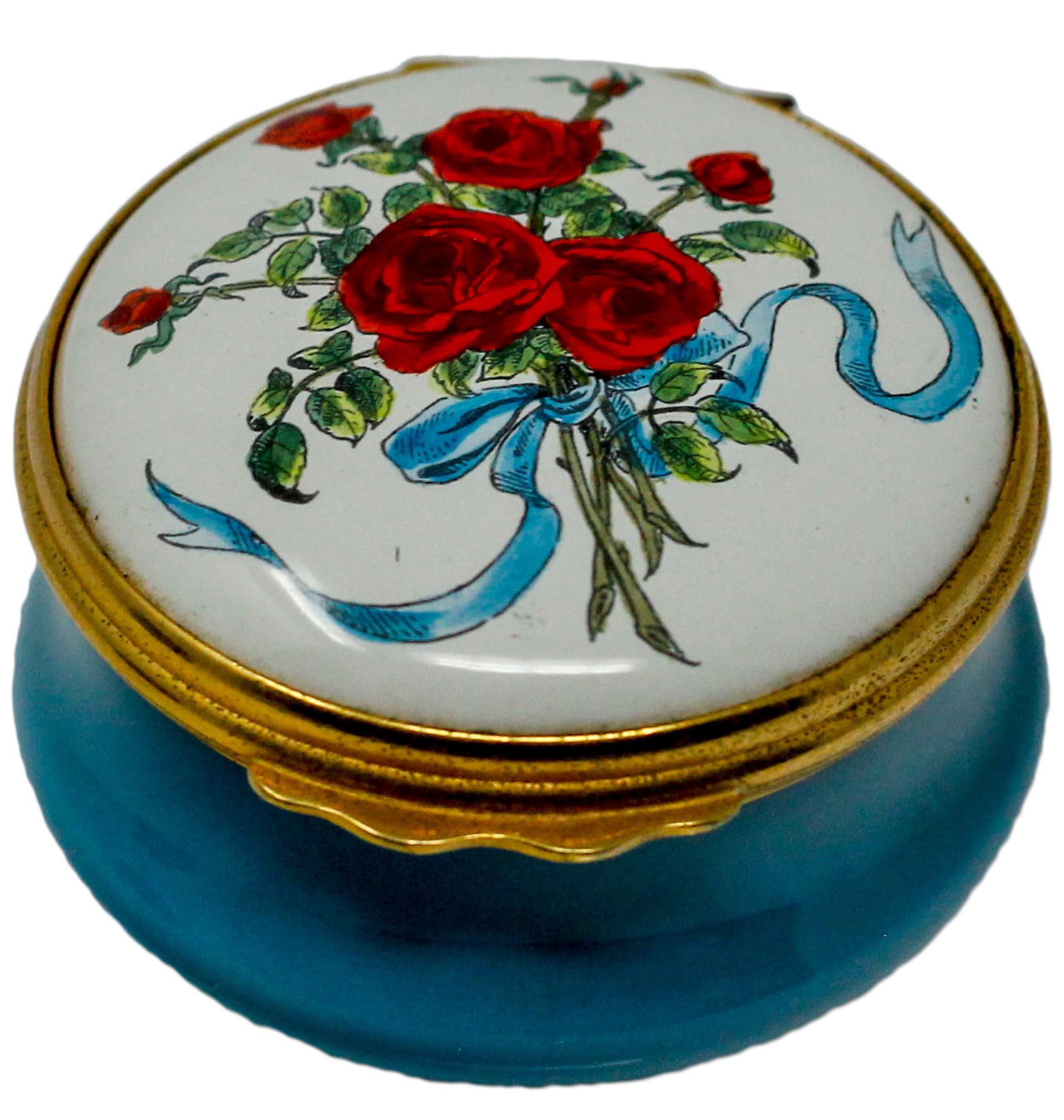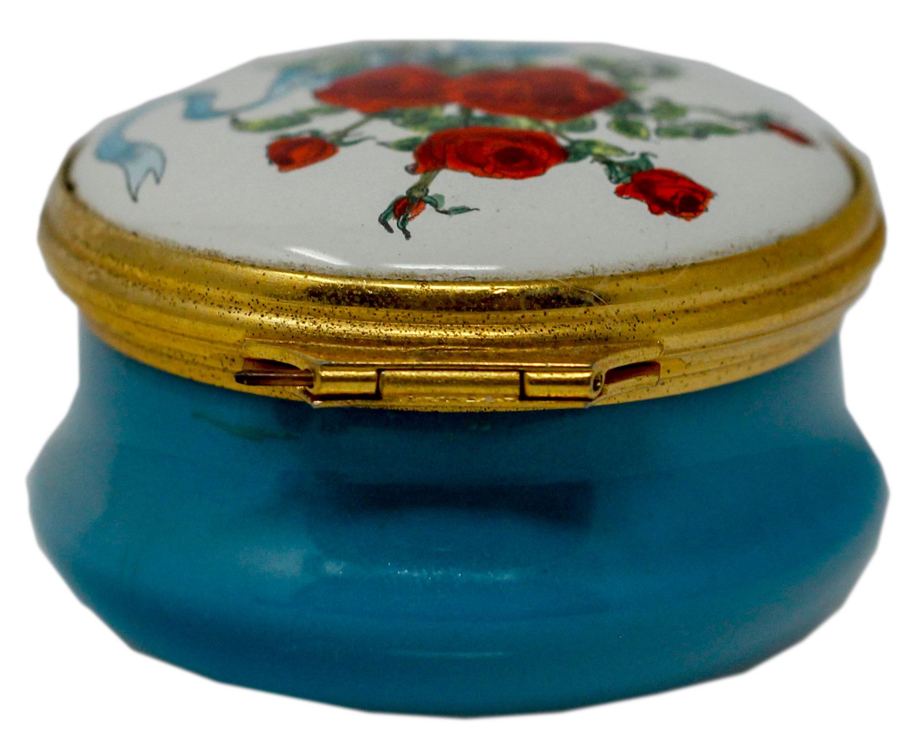 Decorative Cartier pillbox from the personal collection of President Ronald and Nancy Reagan, owned and used by them at their Bel Air, California home. Porcelain and enamel box has a hinged top decorated with a bouquet of red roses, and the phrase on the underside, ''A bouquet with Love''. Box was originally sold at Christie's in New York. Measures 1.75'' in diameter and 1'' high. With Christie's sticker, in near fine condition.