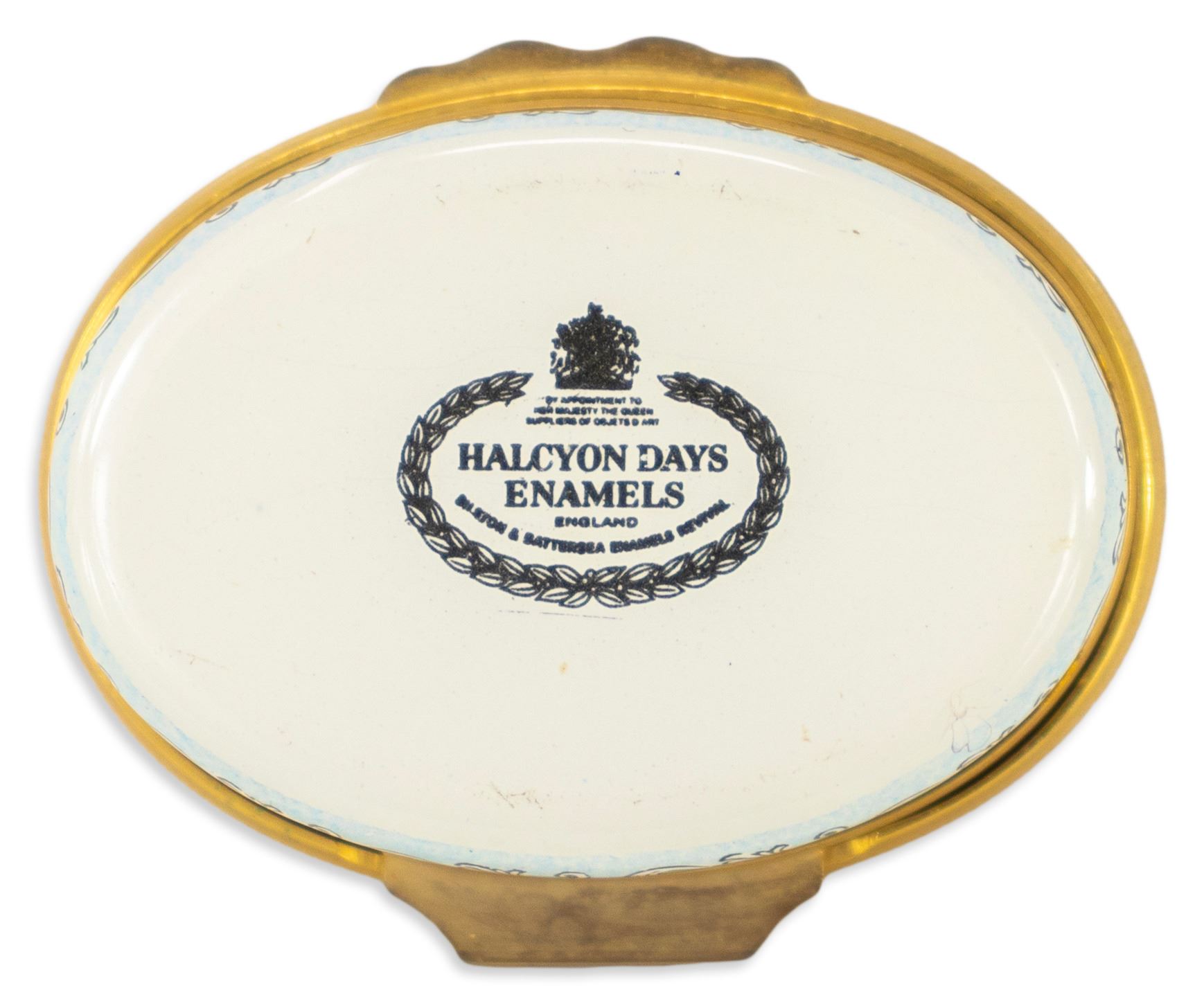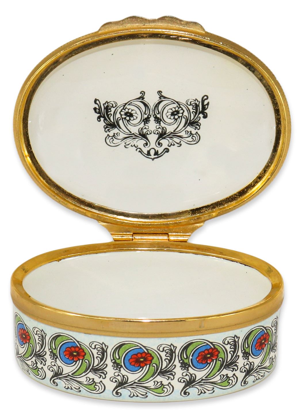 Decorative pillbox from the personal collection of President Ronald and Nancy Reagan, owned and used by the couple in their Bel Air, California home. Porcelain and enamel box has a hinged top decorated with the phrase, ''With our love''. Oval box by Halcyon Days Enamels measures 2.125'' in diameter across widest part, and 1'' high. With Christie's sticker from the Reagan estate sale, in near fine condition.