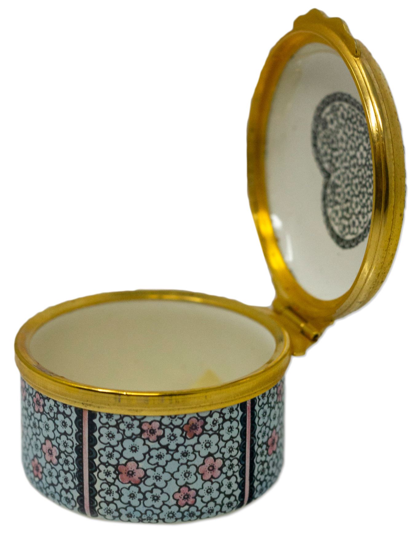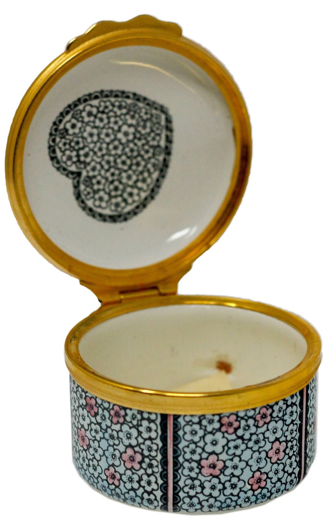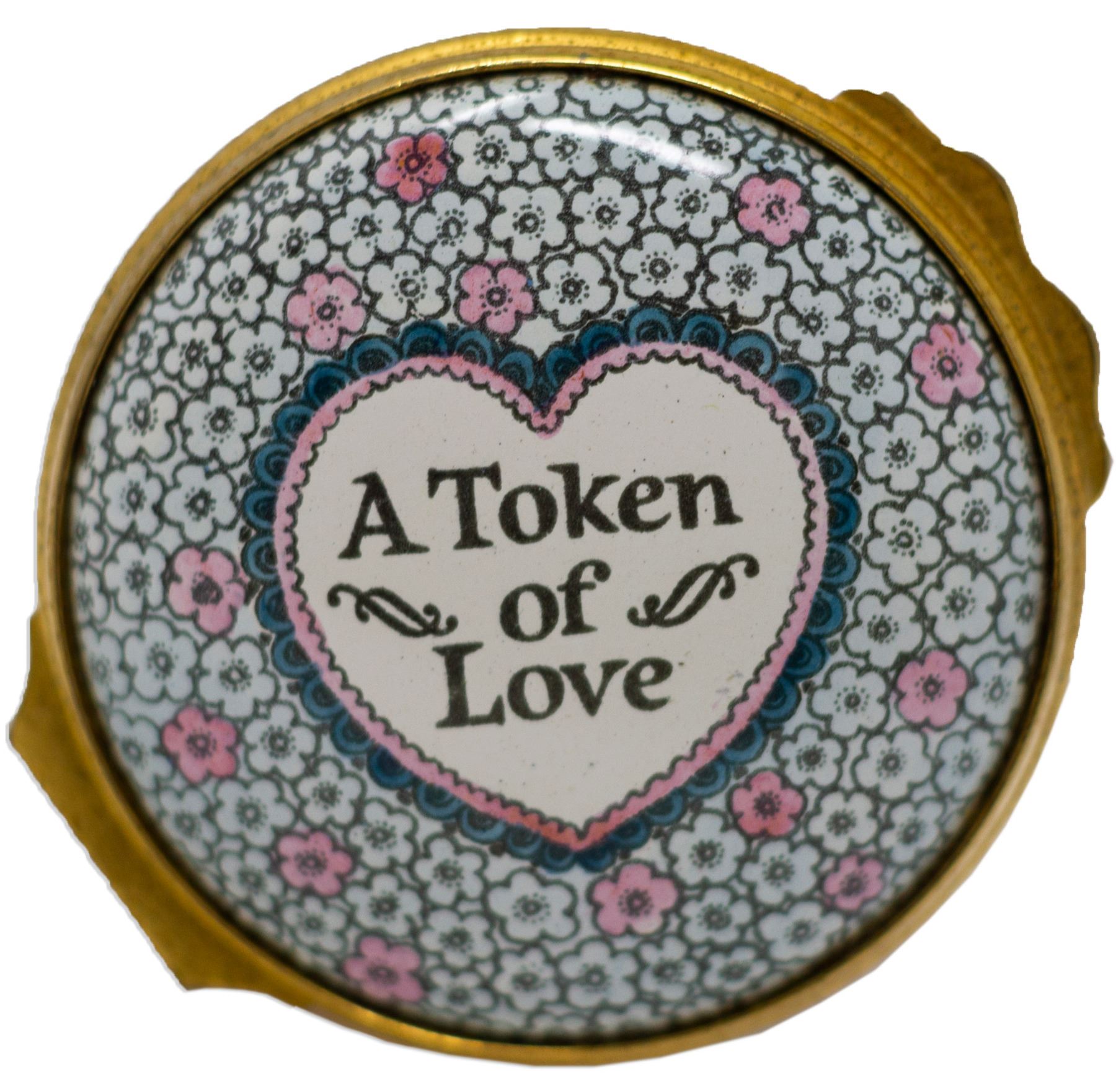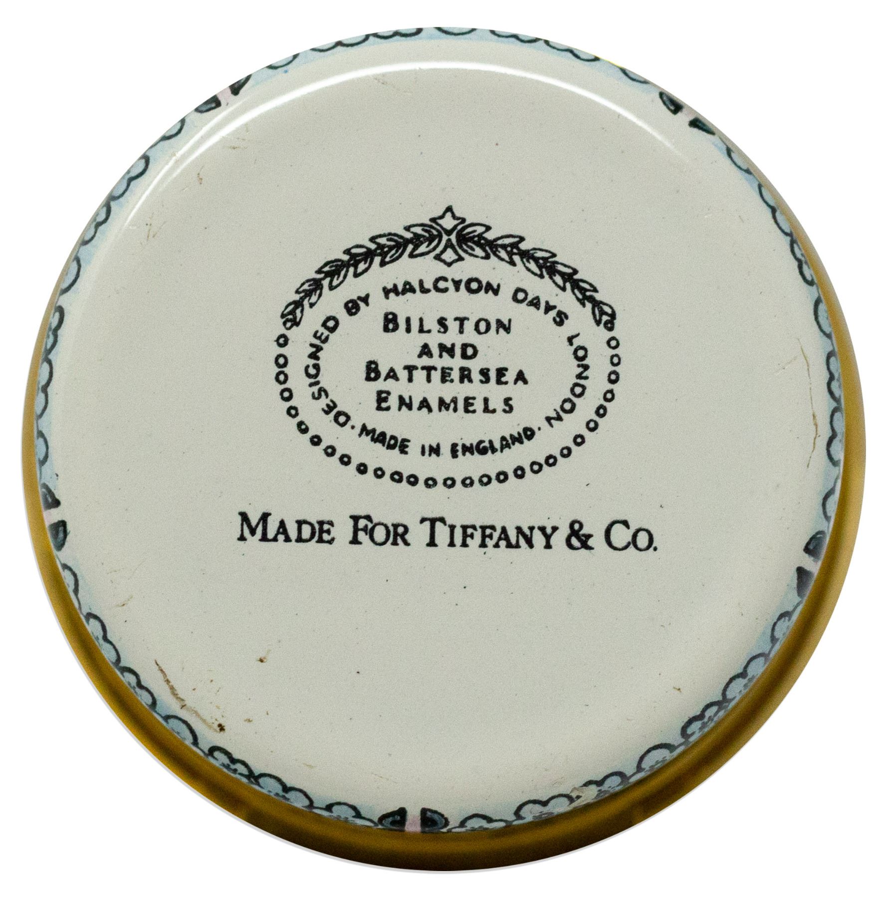 Decorative Tiffany pillbox from the personal collection of President Ronald and Nancy Reagan, owned and used by them at their Bel Air, California home. Porcelain and enamel box has a hinged top decorated with the phrase, ''A Token of Love''. Box was originally sold at Christie's in New York. Measures 1.75'' in diameter and 1'' high. With Christie's sticker, in near fine condition.