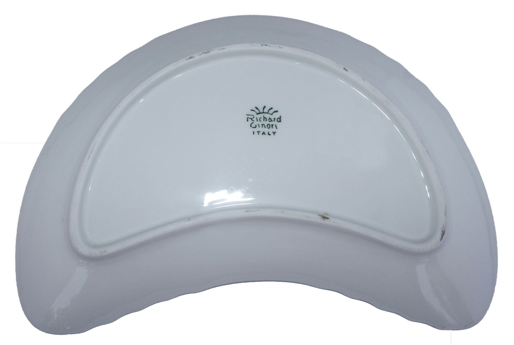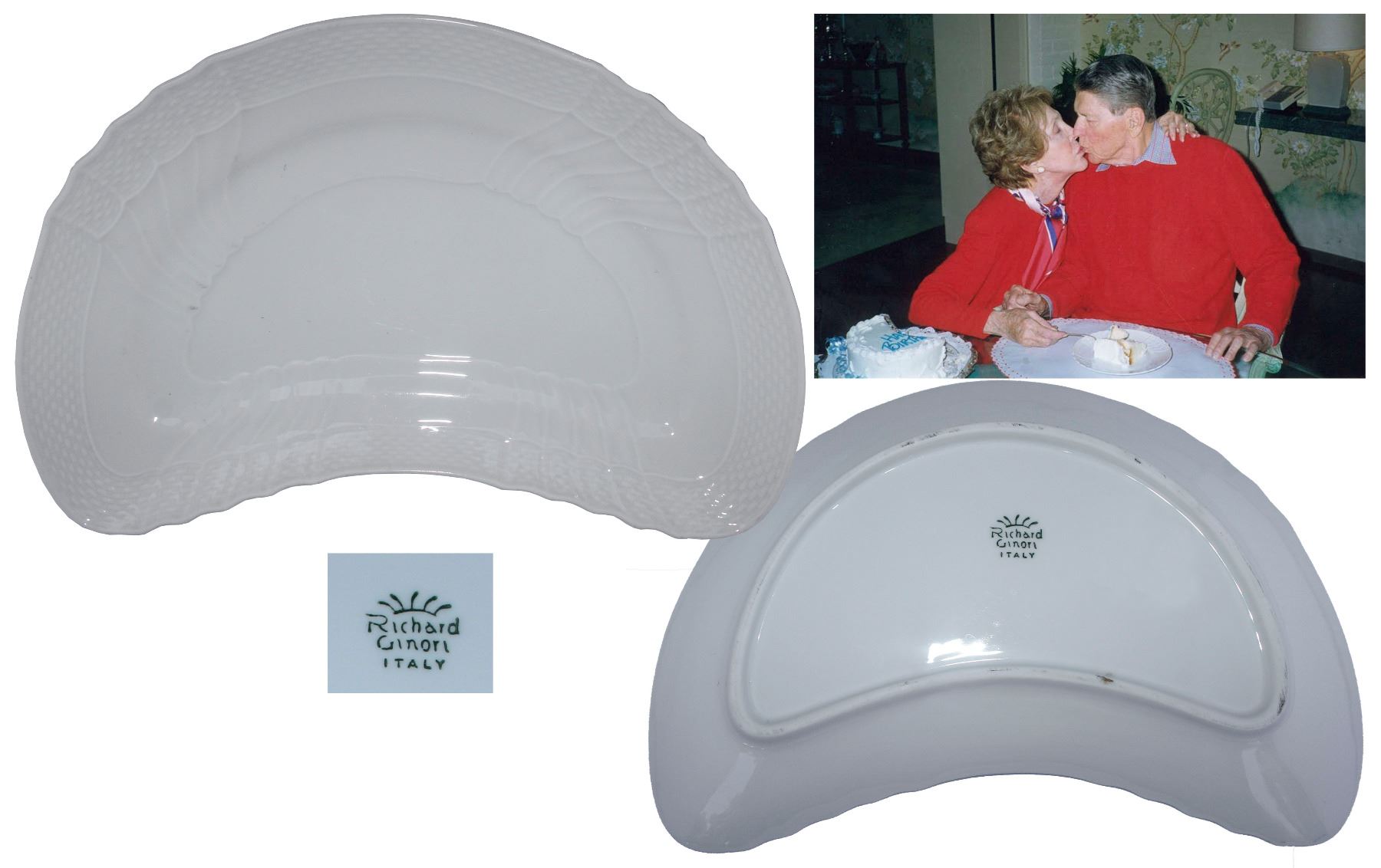 Salad plate from the personal collection of President Ronald and Nancy Reagan, owned and used by them at their Bel Air, California home. Off-white plate is from the storied Italian firm of Richard Ginori, which was founded in 1735 and originally known as the Doccia Porcelain Manufactory by Marchese Carlo Ginori; now known as Richard Ginori, the firm was acquired by Gucci in 2013. Plate was originally sold at Christie's in New York and retains Christie's lotting sticker. Crescent shaped plate measures 9'' at the widest point. Near fine condition. Accompanying photo shows the President and Nancy sharing birthday cake on a plate from this service.