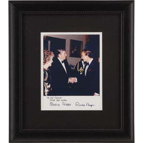 <B>Ronald and Nancy Reagan Photo for Sid Caesar with Autopen Signatures.</B></I> A color 8" x 10" photo of the comedian and television producer meeting the President at a White House function, reading "To Sid Caesar with best wishes" with black autopen signatures of Ron and Nancy Reagan. Matted and framed to an overall size of 15.25" x 17.5" and in Excellent condition. <I>From the Beverly Hills CENSORED Club Celebrity Roast Archive.</B></I><BR><BR><b>Shipping:</b> Framed - with Glass, Medium (<a target="_blank" href="http://www.heritageauctions.com/common/shipping.php">view shipping information</a>)