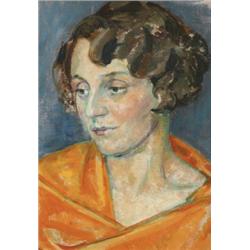 Ronald Ossory Dunlop RA RBA NEAC (1894-1973) PORTRAIT OF MRS HUGH ROBERTS signed on reverse; inscribed in a later hand on reverse oil on canvas board 30 by 23cm., 12 by 9in. Painted circa 1924 when, according to the inscription on reverse, the sitter Mrs Roberts was about thirty years of age and was running a sports shop in Finchley, London. She died circa 1974, in Warkworth, Northumberland.