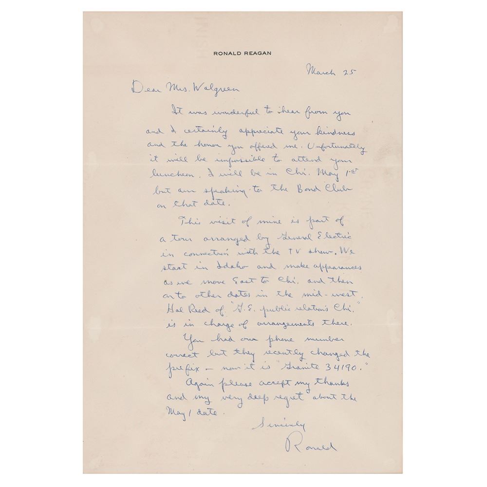 ALS signed ‰ÛÏRonald,‰Û one page, 7.25 x 10.5, personal letterhead, March 25, [no year]. Letter to "Mrs. Walgreen," Myrtle Walgreen, wife of drugstore entrepreneur Charles Walgreen, in part: "It was wonderful to hear from you and I certainly appreciate your kindness and the honor you offered me. Unfortunately it will be impossible to attend your luncheon. I will be in Chi. May 1st but am speaking to the Bond Club on that date. This visit of mine is part of a tour arranged by General Electric in connection with the TV show. We start in Idaho and make appearances as we move east to Chi. and then on to other dates in the mid-west. Hal Reed of 'G.E. public relations Chi.' is in charge of arrangements there. You had our phone number correct but they recently changed the prefix‰ÛÓnow it is 'Granite 34190.'" In fine condition, with small areas of light discoloration along the side edges.