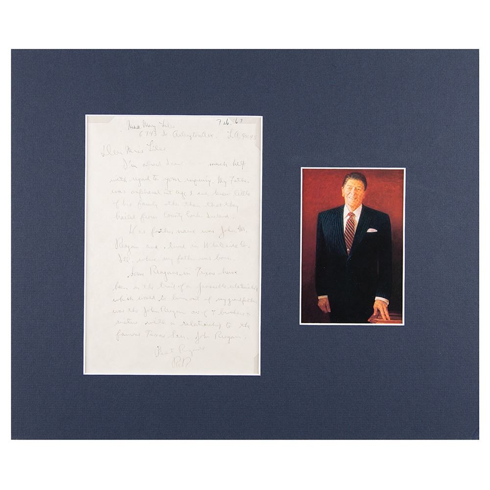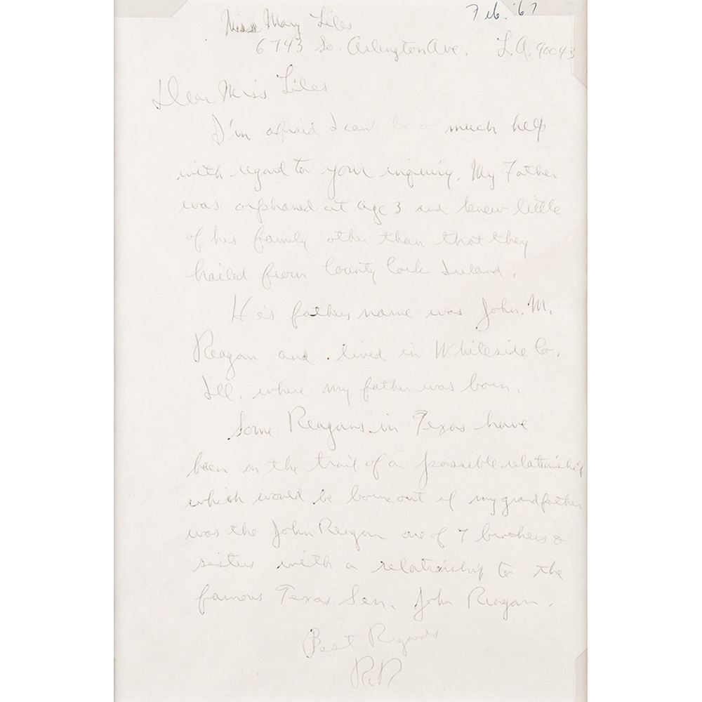 ALS signed “R. R.,†one page, 5.75 x 8.5, [February 1967]. Handwritten letter to Miss May Liles, in full: “I’m afraid I can’t be of much help with regard to your inquiry. My Father was orphaned at age 3 and knew little of his family other than that they hailed from County Cork Ireland. His father’s name was John M. Reagan and lived in Whiteside Co. Ill. where my father was born. Some Reagans in Texas have been on the trail of a possible relationship which would be borne out if my grandfather was the John Reagan one of 7 brothers & sisters with a relationship to the famous Texas Sen. John Reagan.†Matted with a portrait to an overall size of 15.5 x 13. In very good to fine condition, with overall fading, and small words ("be of") very light.