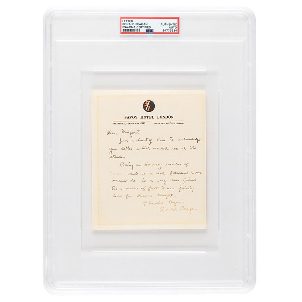 ALS, one page, 5.25 x 6.25, Savoy Hotel London letterhead, no date. Handwritten letter to "Margaret," in full: "Just a hasty line to acknowledge your letter which reached me at the studio. Being an Honorary member of Mike& #39;s club is a real pleasure to me because he is a very dear friend. As a matter of fact I am joining him for dinner tonight." In fine condition, with fading to one word of text, and toning from prior display. Encapsulated in a PSA/DNA authentication holder.