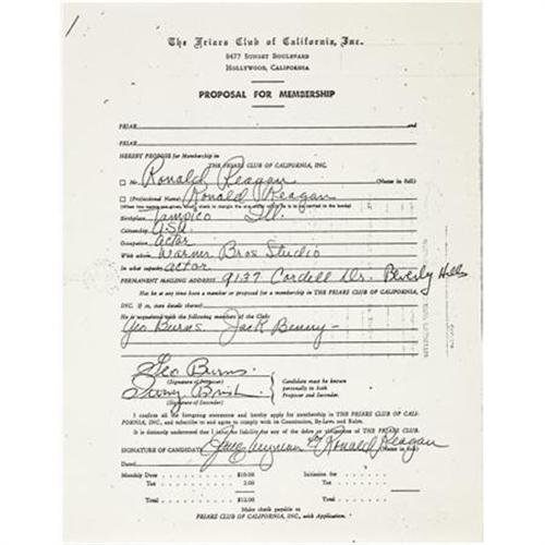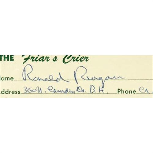 <B>The Beverly Hills CENSORED Club Ronald Reagan File, With His Signature on a Card.</B></I> This file on Ronald Reagan from the Beverly Hills CENSORED Club includes a card on which he signed his name in full in blue ink, along with his address, phone number, and birthday. The contents include a 1951 letter requesting a donation to a charity drive, a 1955 letter informing Reagan he's been selected as a member of the Board of Directors, and later letters regarding honorary membership for then-Governor Reagan. Included is a photocopy of Reagan's original proposal for membership, in which it's noted he's working for Warner Bros. and is acquainted with members George Burns and Jack Benny. Signature of candidate reads, "Jane Wyman for Ronald Reagan"; Ms, Wyman, of course, having been his first wife. A fascinating file in Excellent condition. <I>From the Beverly Hills CENSORED Club Celebrity Roast Archive.</B></I><BR><BR><b>Shipping:</b> Flat Material, Small (<a target="_blank" href="http://www.heritageauctions.com/common/shipping.php">view shipping information</a>)