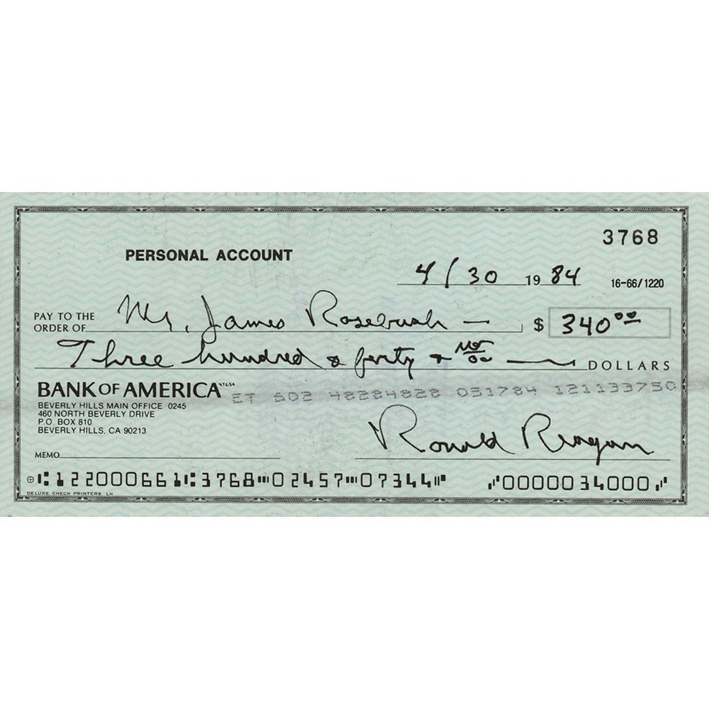 Scarce "Personal Account" check, 6 x 2.75, filled out and signed by Ronald Reagan as president, payable to Mr. James Rosebush for $340, April 30, 1984. In very fine condition. James Rosebush was a Deputy Assistant to President Reagan, the Chief of Staff to First Lady Nancy Reagan, and a Senior Advisor at the White House. Checks signed by Reagan while as president remain quite rare and sought-after.