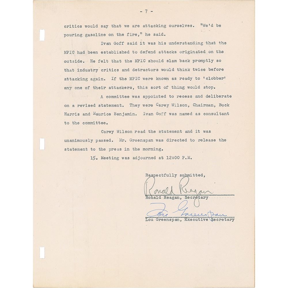 DS in pencil, eight pages, 8.5 x 11, January 19, 1955. Document headed "Minutes of the Annual Membership Meeting of the Motion Picture Industry Council." In part: "Allen Rivkin brought up the fact that…the MPA had attacked the Guild in the trade papers because of an anti-communist resolution that had been voted down…He stated that nine of suspected communist members have left the guild and one will soon be leaving…[Art Arthur] felt sure that the next time the resolution came before the Writers' Guild, it would pass. He said he was sure there are still some unknown communists in the Guild-writers who have eluded both the Guild and Management. He was afraid that just about the same time the MPIC released a statement to the press about their faith in the Writers, possibly next week something would be uncovered regarding the communists. If this should happen, all the prestige the MPIC has gained would be lost…Ronald Reagan was not in favor of Mr. Rivkin's resolution as it was worded." In fine condition. A fascinating document connecting Reagan's acting and political careers, as 1950s Hollywood communism developed into 1980s international Cold War crisis.