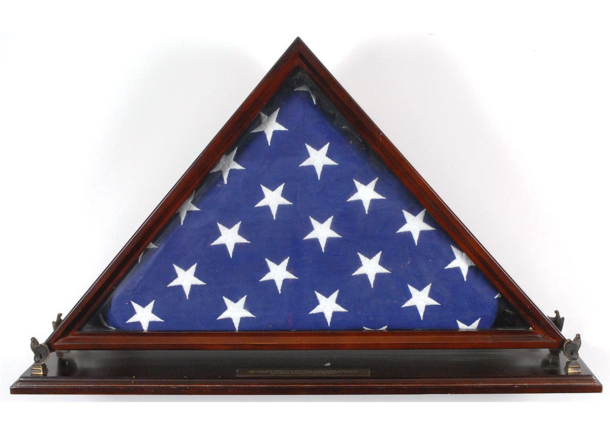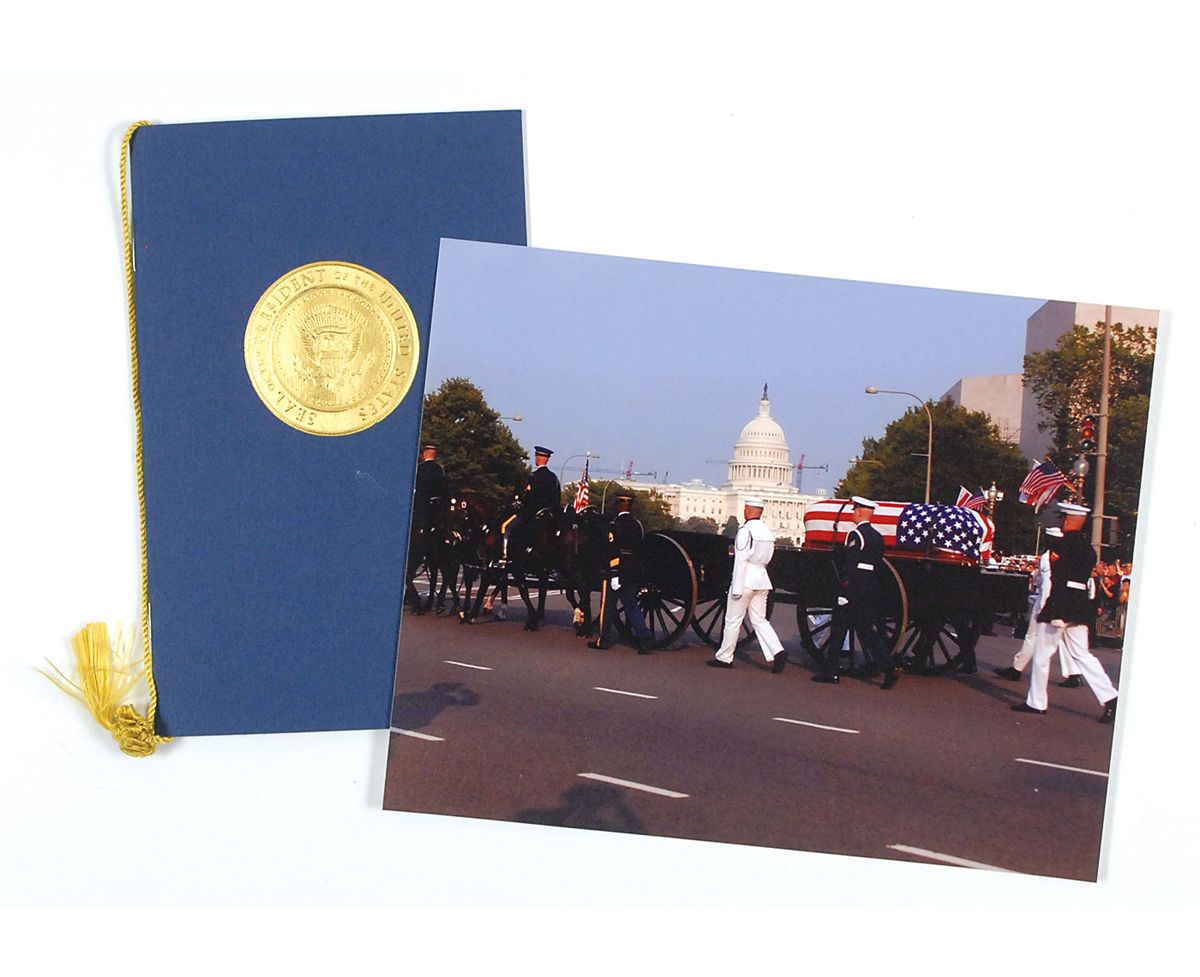 Three items from the official state funeral and proceedings of President Ronald Reagan: first, the official 60 x 34 American flag which flew over the Capitol Building on June 9, 2004, in honor of Reagan, accompanied by a certificate from the Architect of the Capitol. Flag is housed in a wooden triangular display stand with a descriptive plaque mounted on the base. Second, a program from the June 9, 2004, VIP service held in the Capitol Rotunda. And third, a color 10 x 8 glossy photo of Reagan’s horse drawn caisson passing in front of the Capitol. In overall fine condition.