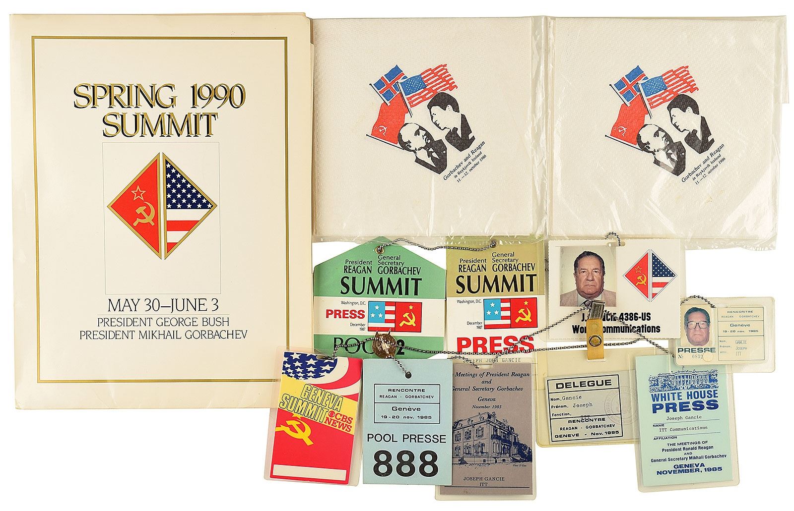 Collection of items associated with the meetings of Ronald Reagan, George Bush, and Mikhail Gorbachev, including: two sets of napkins commemorating the 1986 meeting of Gorbachev and Reagan in Reykjavik; three different press passes/credentials for the Reagan/Gorbachev summit on a chain; six different press passes/credentials for the 1985 Reagan/Gorbachev summit in Geneva, held together on a chain; and a press corps packet of information for the Spring 1990 Bush/Gorbachev summit. In overall fine condition.