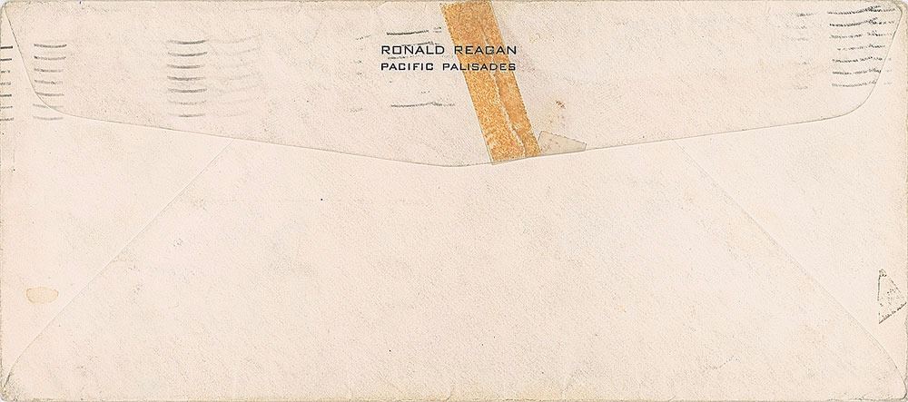 Amazing hand-edited copy of Reagan's "A Time for Choosing" speech, three pages, 8.5 x 14, postmarked January 26, 1965, signed and inscribed on the reverse of the last page in fountain pen, "Dear Gene, Thanks for your good letter. I thought you might like a copy of this. Give your folks my regards, Ronald Reagan." The speech features nearly forty instances of emendations made by Reagan, with the majority consisting of omissions and strikethroughs, plus the presence of a few added words and edited punctuation. The speech, in part: "This is the issue of this election: whether we believe in our capacity for self-government or whether we abandon the American revolution and confess that a little intellectual elite in a far-distant capitol can plan our lives for us better than we can plan them ourselves. You and I are told increasingly that we have to choose between a left or right, but I would like to suggest there is no such thing as a left or right. There is only an up or down—up to man's age-old dream—the ultimate in individual freedom consistent with law and order—or down to the ant heap of totalitarianism. And, regardless of their sincerity, their humanitarian motives, those who would trade our freedom for security have embarked on this downward course…I, for one, resent it when a representative of the people refers to you and me—the free men and women of this country—as 'the masses.' This is a term we haven't applied to ourselves in America. But beyond that, 'the full power of centralized government'—this was the very thing the Founding Fathers sought to minimize. They knew that governments don't control things. A government can't control the economy without controlling people. And they know when a government sets out to do that, it must use force and coercion to achieve its purpose. They also knew, those Founding Fathers, that outside of its legitimate functions, government does nothing as well or as economically as the private sector of the economy." In fine condition. Accompanied by the original mailing envelope, addressed in Reagan's own hand.