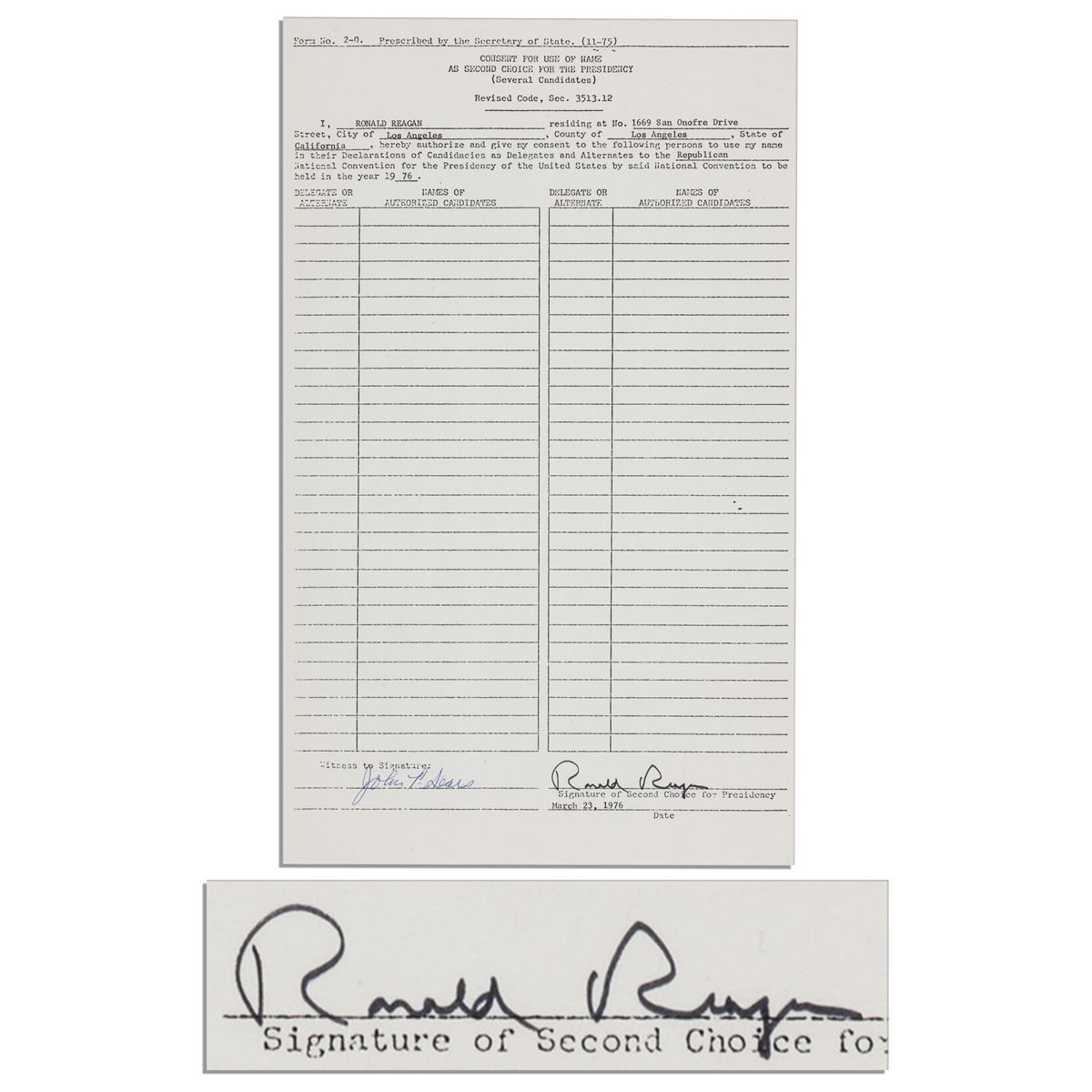 Ronald Reagan Ohio delegate consent form signed, dated 23 March 1976. Document is a photocopy of an original form, used to quickly procure signatures in Ohio as Reagan only had 72 hours to collect 1,000 signatures in order to challenge Gerald Ford in the Republican primary. Document is headlined: ''...the following persons to use my name in their Declarations of Candidacies as Delegates and Alternates to the Republican National Convention for the Presidency of the United States by said National Convention to be held in the year 1976...'' Signed clearly ''Ronald Reagan'' at bottom in black ink; countersigned by campaign manager in blue ink, ''John P. Sears''. Document on one page measures 8.5'' x 14''. Near fine condition.
