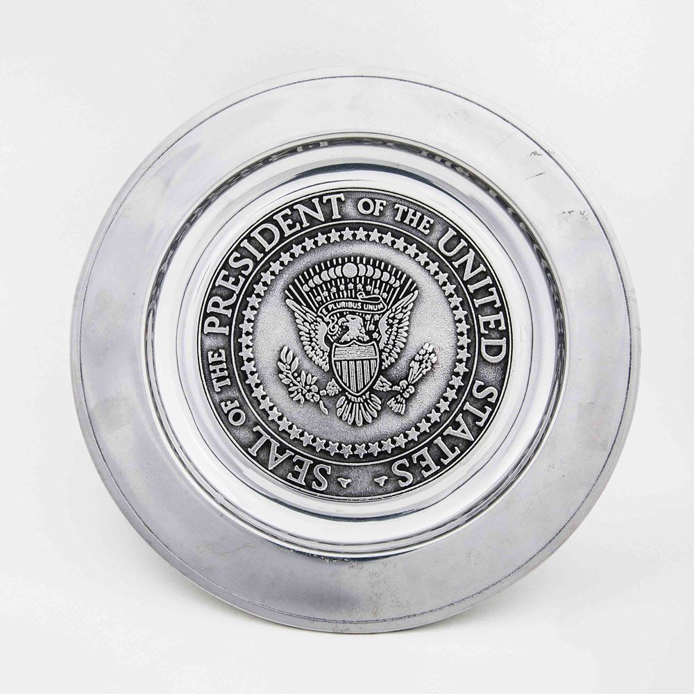 Alluring presidential pewter gift plate made by The Wilton Company, as authorized by the Reagan administration. Plate measures 10.75? in diameter with a deep relief engraving of the presidential seal in the center. Bottom is stamped “The Wilton Co.” In fine condition. During President Reagan’s administration, he or a few of his senior staff members would present these quality pewter plates as coveted presidential gifts.
