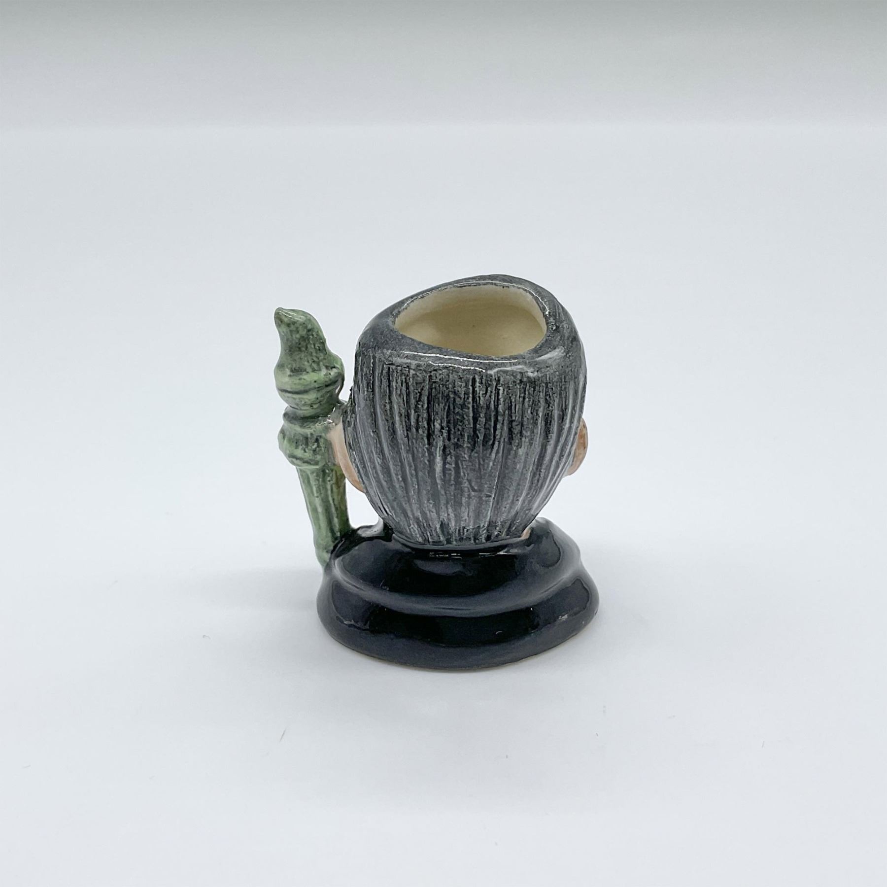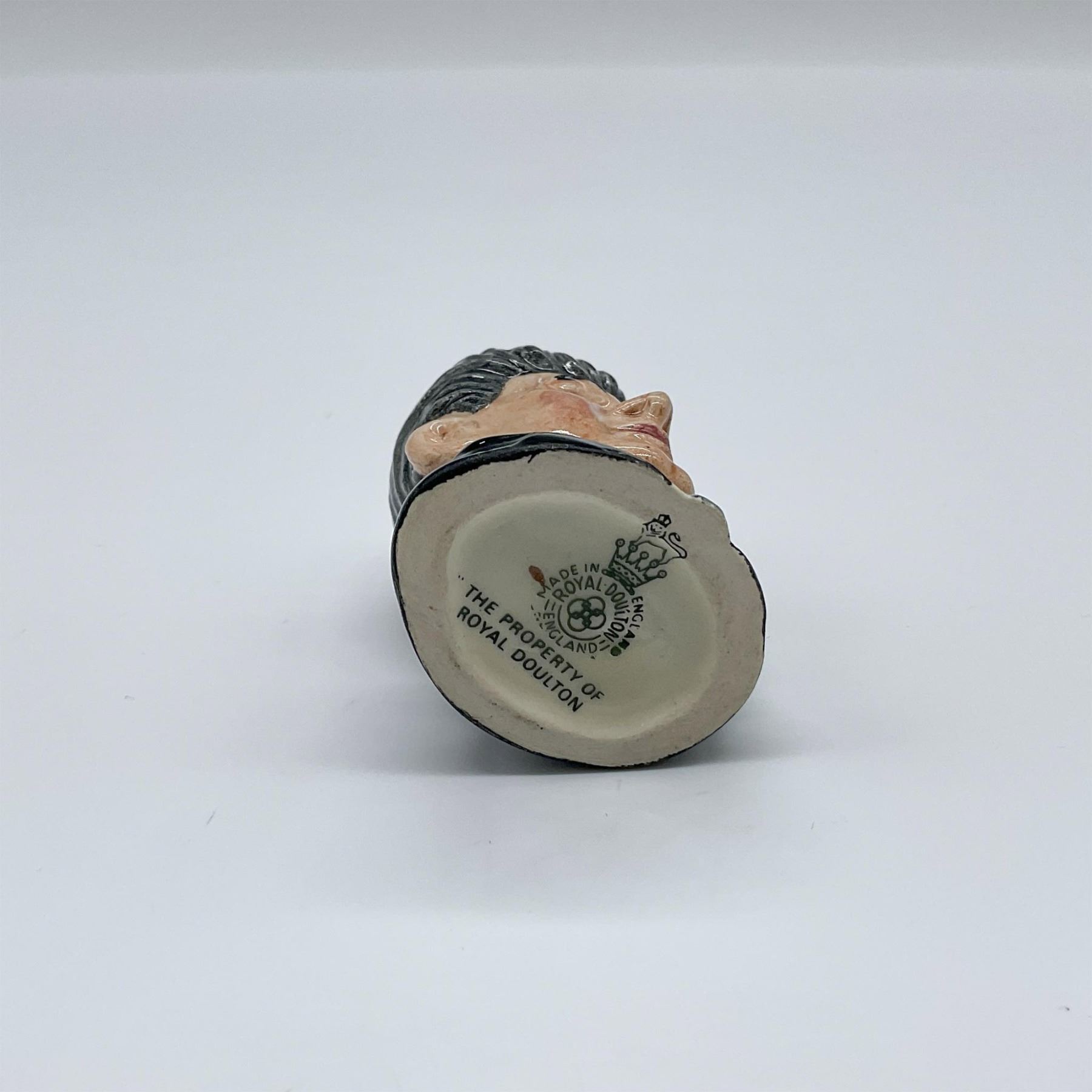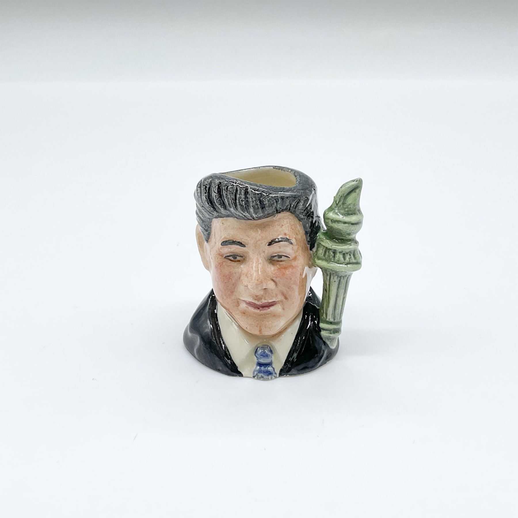 20th century icon. Hand painted prototype colorway tiny figural jug of the 40th U.S. President. Black suit, blue tie, and gray hair. Green liberty torch. Royal Doulton backstamp. The Property Of Royal Doulton.