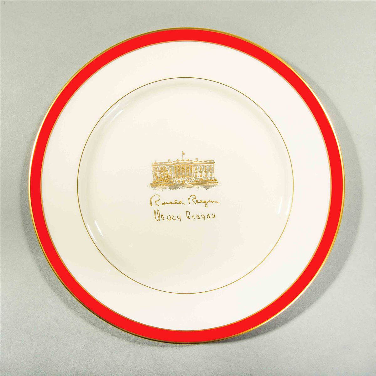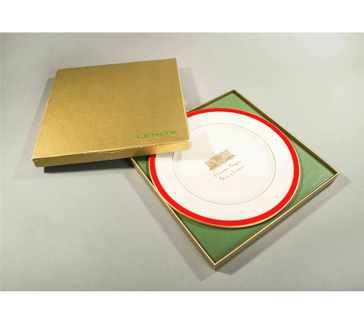 Striking Lenox china signature plate, 10.5? in diameter, featuring a scarlet red border and an image of the White House and facsimile signatures of Ronald and Nancy Reagan printed in gold in the center. Reverse is marked, “Lenox, The White House.” Plate comes in its original Lenox box. In very fine condition. At times, President and Mrs. Reagan would present these quality Lenox plates to their personal White House luncheon guests.