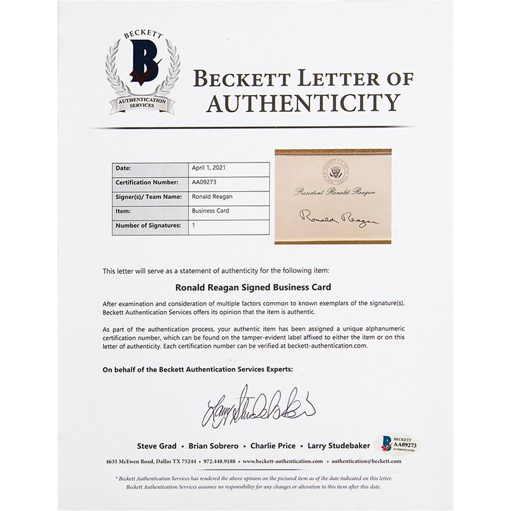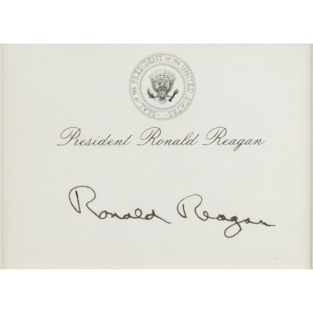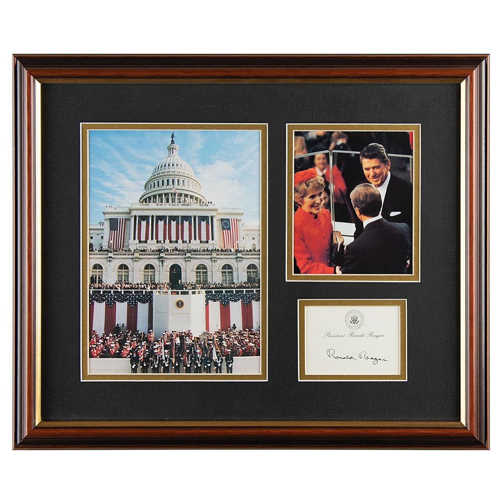 Felt tip signature, "Ronald Reagan,†on an off-white 3.5 x 2.5 card imprinted with "President Ronald Reagan" and the presidential seal. Attractively double-matted and framed with two photos of his inauguration to an overall size of 18 x 15. In very fine condition. Accompanied by a full letter of authenticity from Beckett Authentication Services.