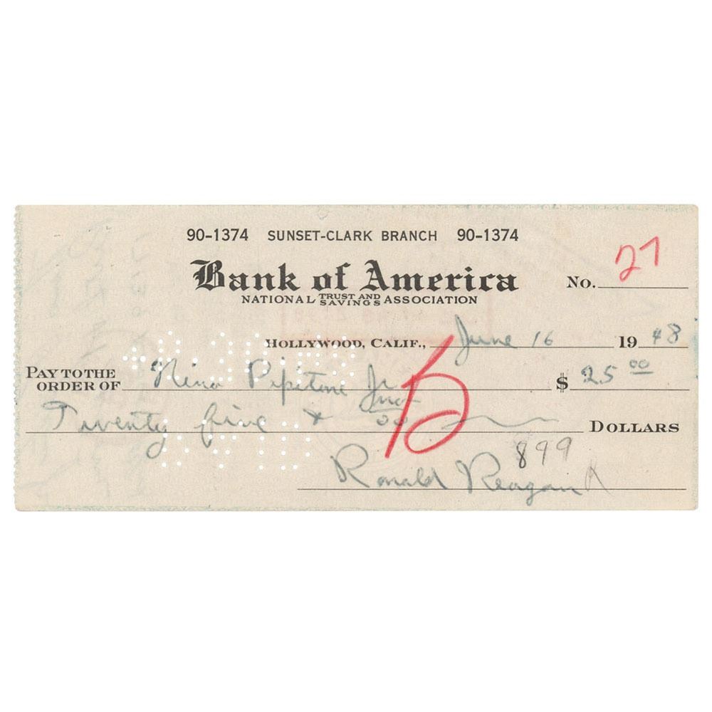 Bank of America check, 5.75 x 2.5, filled out and signed by Reagan, "Ronald Reagan," payable to Nino Pipitone Jr. for $25, June 16, 1948. In fine condition. Reagan and Nino Pipitone, Sr., appeared in two films together—The Voice of the Turtle (1947) and John Loves Mary (1949). The younger Pipitone appeared as an uncredited child in several films, including The Song of Bernadette, Heaven Can Wait, and A Bell for Adano.