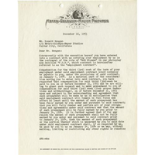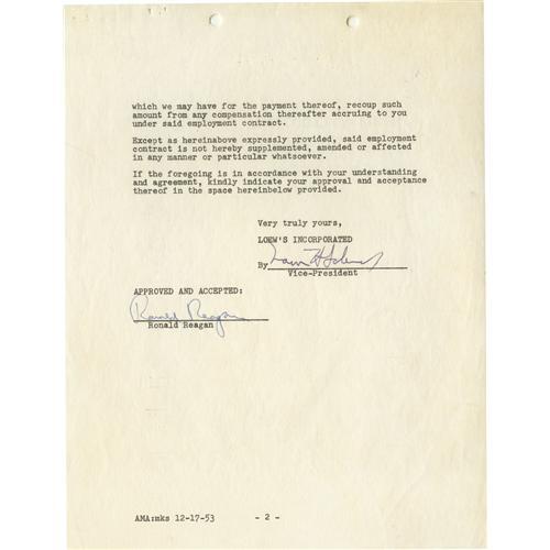 <B>Ronald Reagan Signed Contract.</B></I> A two-page, double-sided contract on MGM letterhead dated December 16, 1953, modifying Reagan's payment schedule for the war drama <I>Prisoner of War,</B></I> signed by the actor in blue ink on the last page. In Very Fine condition with mild wear plus staple and punch holes to the top edge. <I>Accompanied by a COA from PSA/DNA.</B></I><I>Accompanied by LOA from PSA/DNA.</B></I><BR><BR><b>Shipping:</b> Small Flat (<a target="_blank" href="http://www.heritageauctions.com/common/shipping.php">view shipping information</a>) <BR><BR><B>Important notice:<