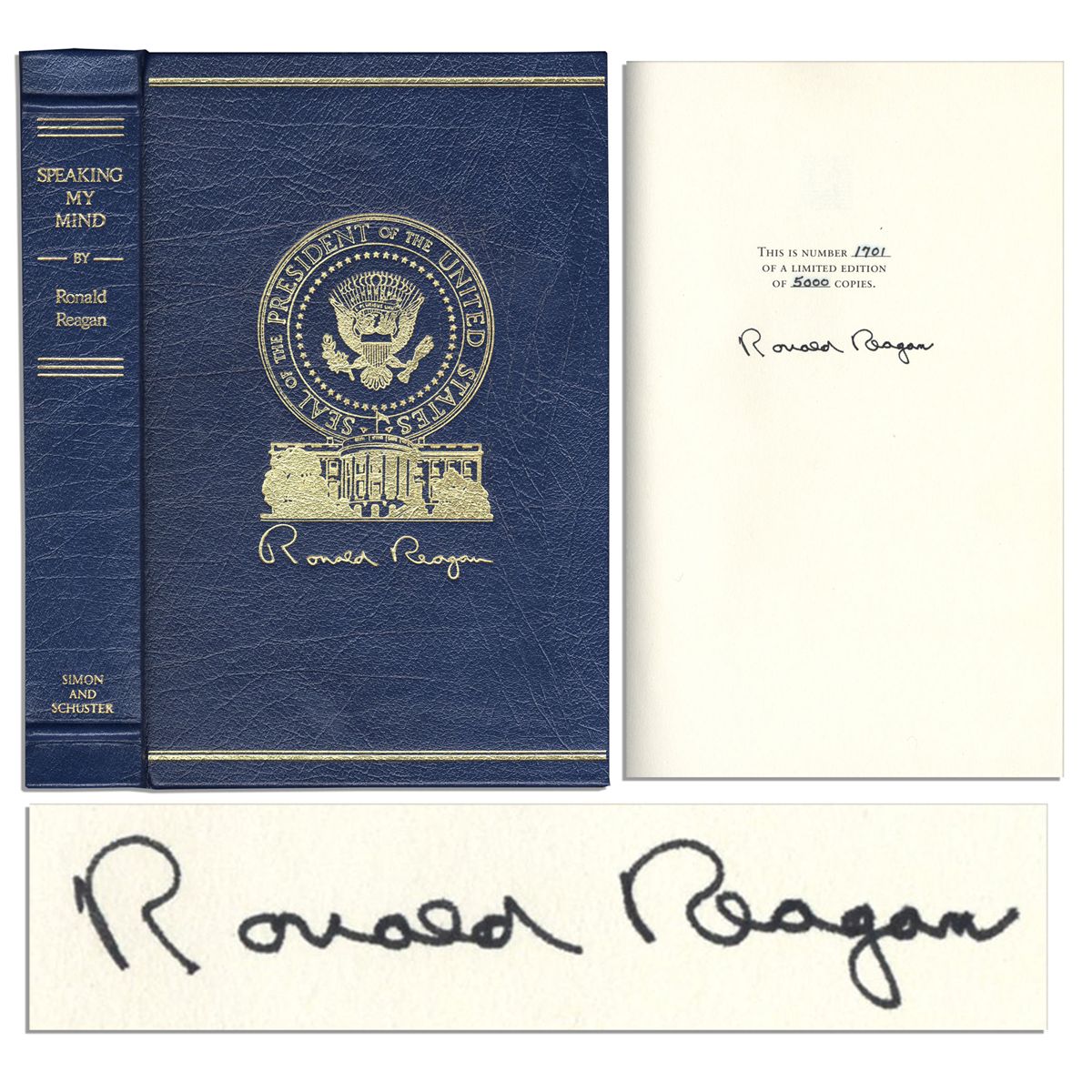 Ronald Reagan signed limited edition of his famous speeches in ''Speaking My Mind.'' Simon and Schuster: 1989. The widely popular U.S. President signs the fly-leaf in black ink which lists this edition as #1701 of 5000 copies. Published here are public addresses dating from his years as California governor through his historic years as 40th President including the famous: ''Mr. Gorbachev, tear down this wall''. 442pp. book measures 6.5'' x 9.5''. Bound in blue leather boards with gilt edges and embellishments. Near fine.