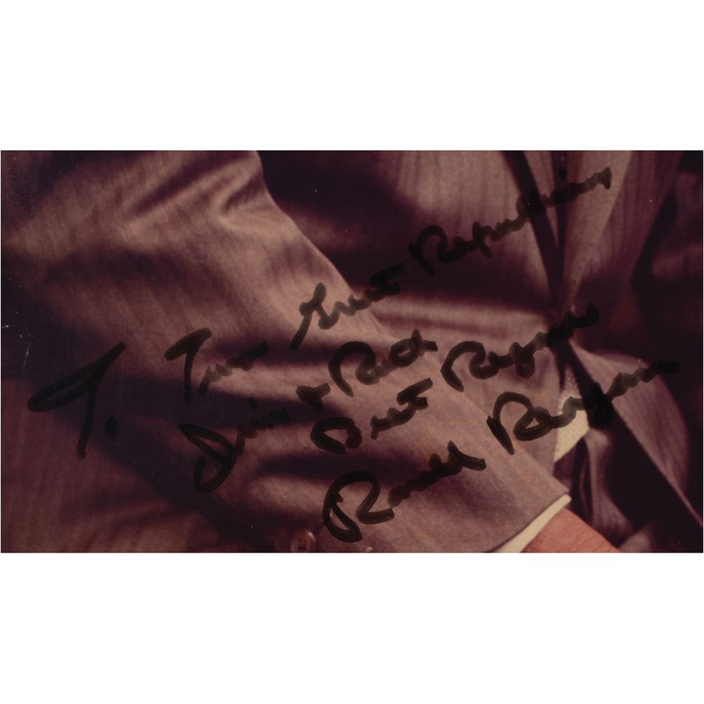 Huge color satin-finish 19.5 x 23.5 photo of Reagan seated in his office by Pyle, signed and inscribed in black felt tip, "To Two Great Republicans, Jim & Ruth, Best Regards, Ronald Reagan.‰Û Framed to an overall size of 22.25 x 26.25. In fine condition, with a few light scratches to the emulsion.